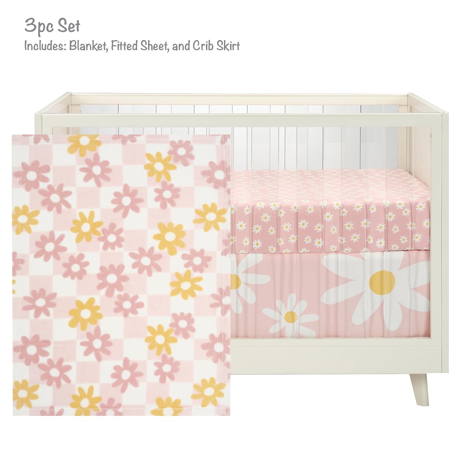 - 3-piece crib bedding set includes one warm and cozy blanket, one breathable 100% cotton fitted crib sheet, and one decorative crib skirt