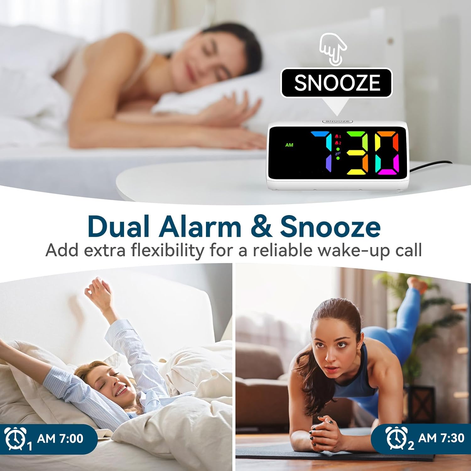 Netzu Loud Alarm Clock for Heavy Sleepers, RGB Alarm Clocks for Bedrooms Seniors Kids, Plug in Digital Clock with 5 Dimmers, 2 Alarms, 4 Volumes and Snooze (White)