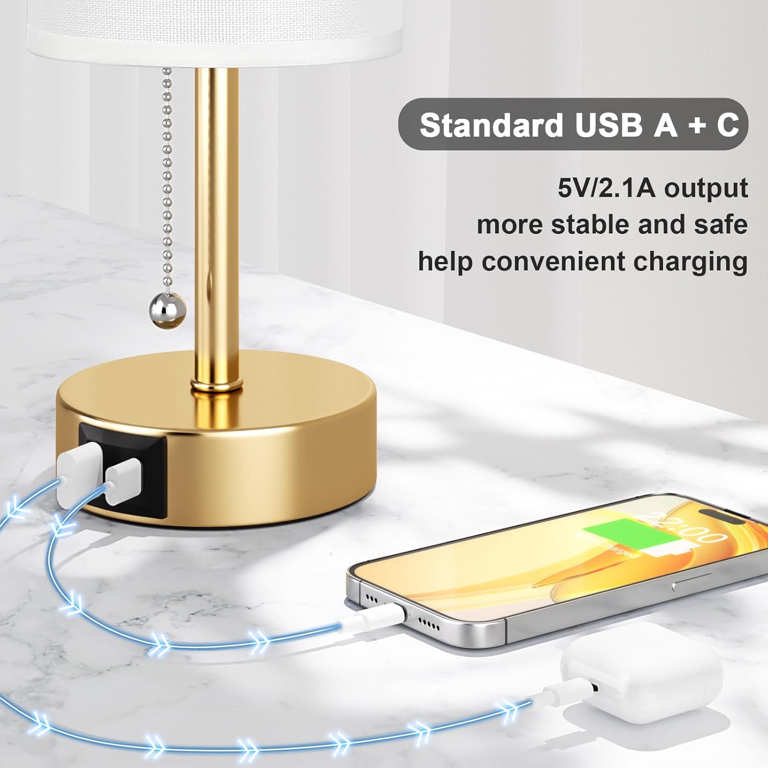 Gold Bedside Lamp for Bedroom Nightstand - Small Table Lamp with USB A + C Charging Port, 3 Color Temperatures Pull Chain Night Stand Light, Side Table Desk Reading Lamp for Living Room/Dorm Room
