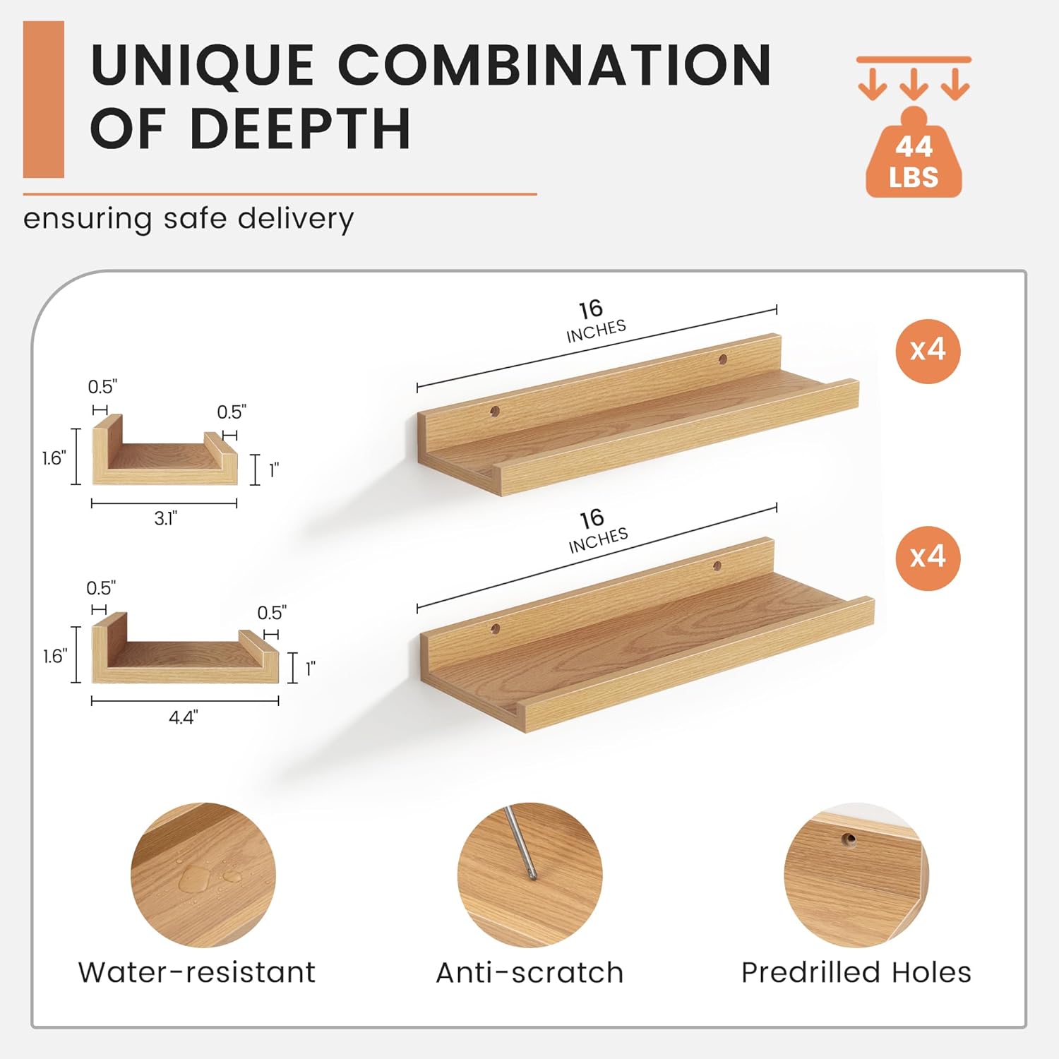 Floating Picture Ledge Shelves for Wall Set of 8, 16 Inch Wall Shelves with Lip Long Large Nursery Book Shelf for Toys Storage Kids Bookshelf Wall Mounted Living Room Bedroom Decor Frames