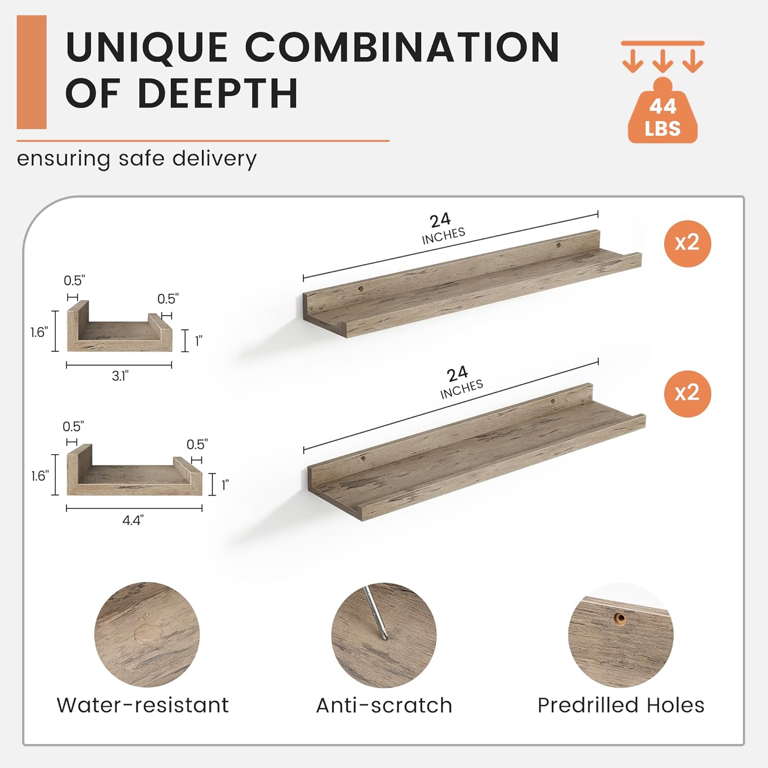 Floating Picture Ledge Shelves for Wall Set of 4, 24 Inch Wall Shelves with Lip Long Large Nursery Book Shelf for Toys Storage Kids Bookshelf Wall Mounted Living Room Bedroom Decor Frames