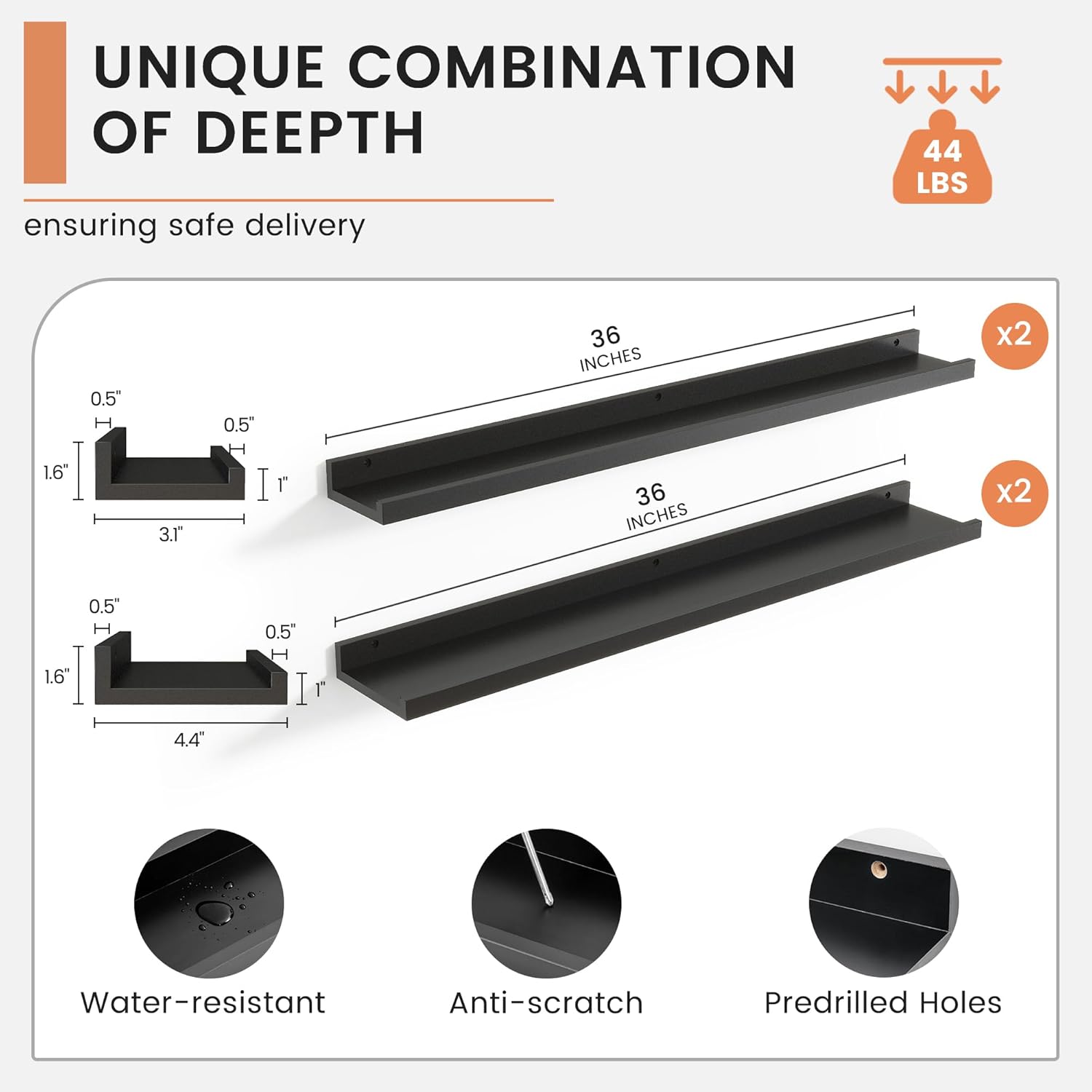 Floating Picture Ledge Shelves for Wall Set of 4, 36 Inch Wall Shelves with Lip Long Large Nursery Book Shelf for Toys Storage Kids Bookshelf Wall Mounted Living Room Bedroom Decor Frames