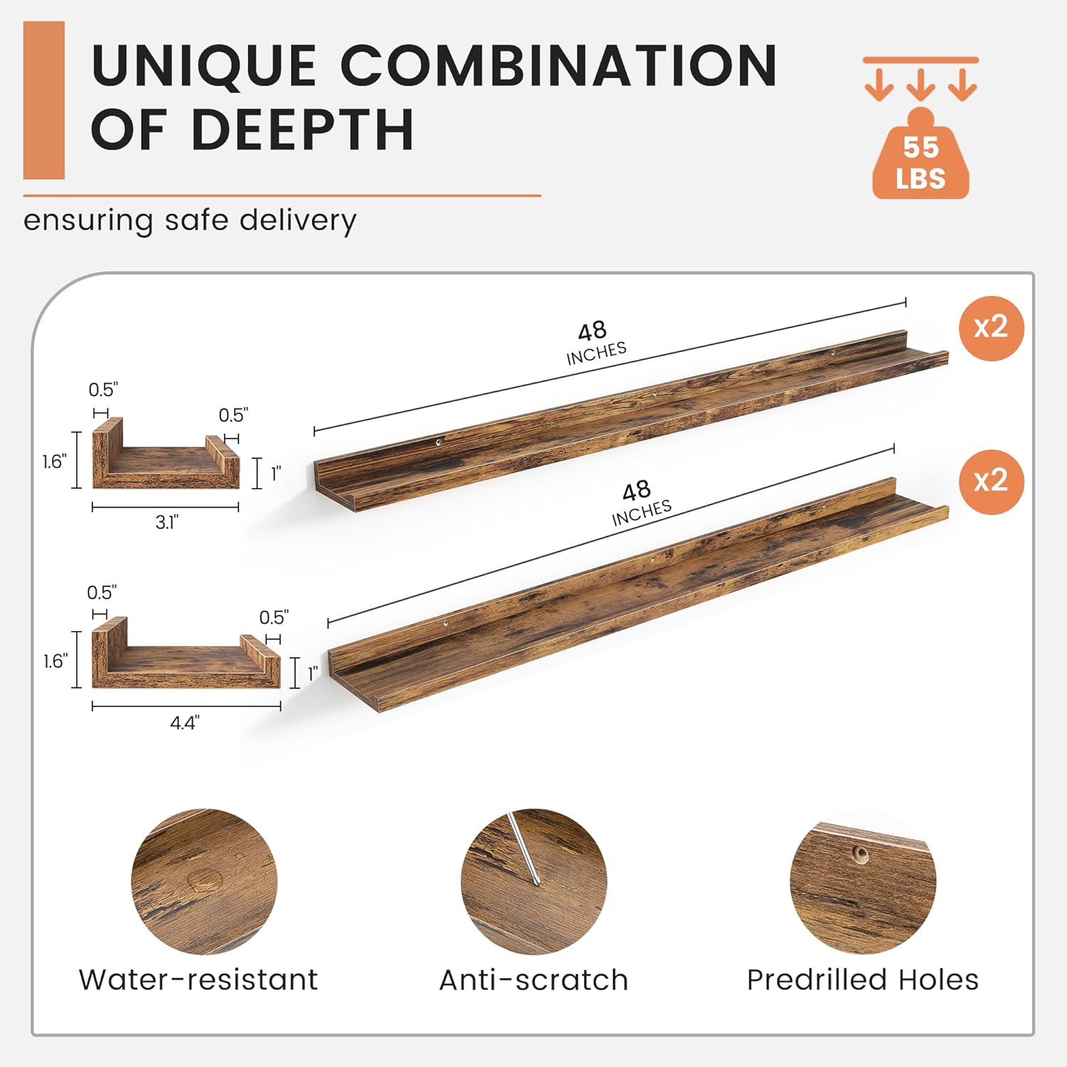 - ăBuilt to LastăEach floating wood shelves is made of high-quality wood, each shelf is designed for exceptional durability. The mounting holes are spaced 16 inches apart for secure wall stud installation, ensuring rock-solid support for your cherished items. Enjoy years of reliable use without sagging or warping