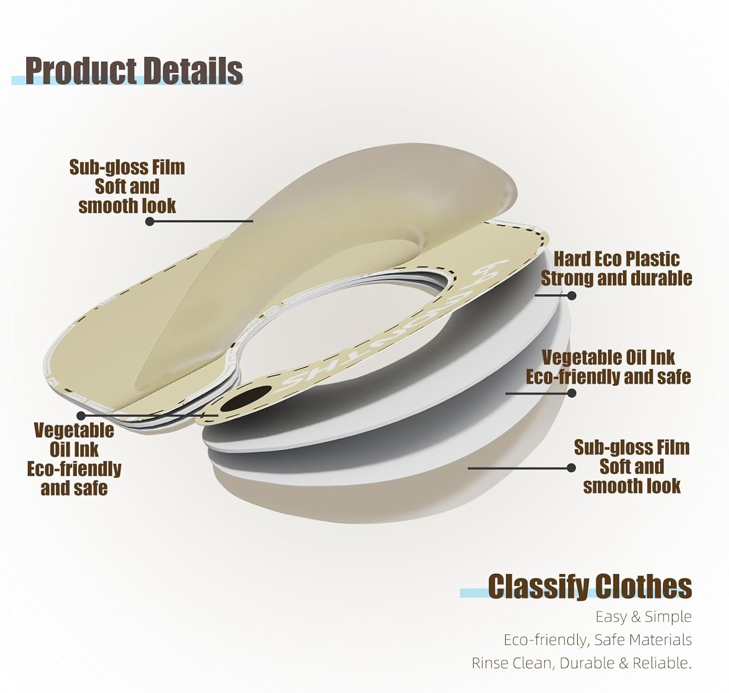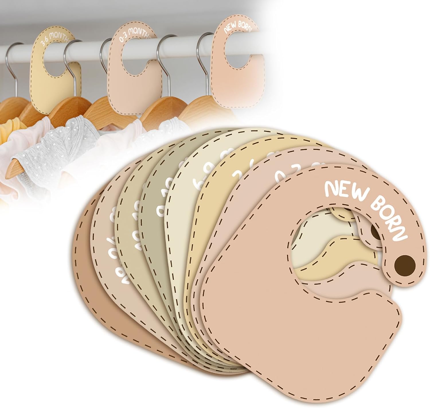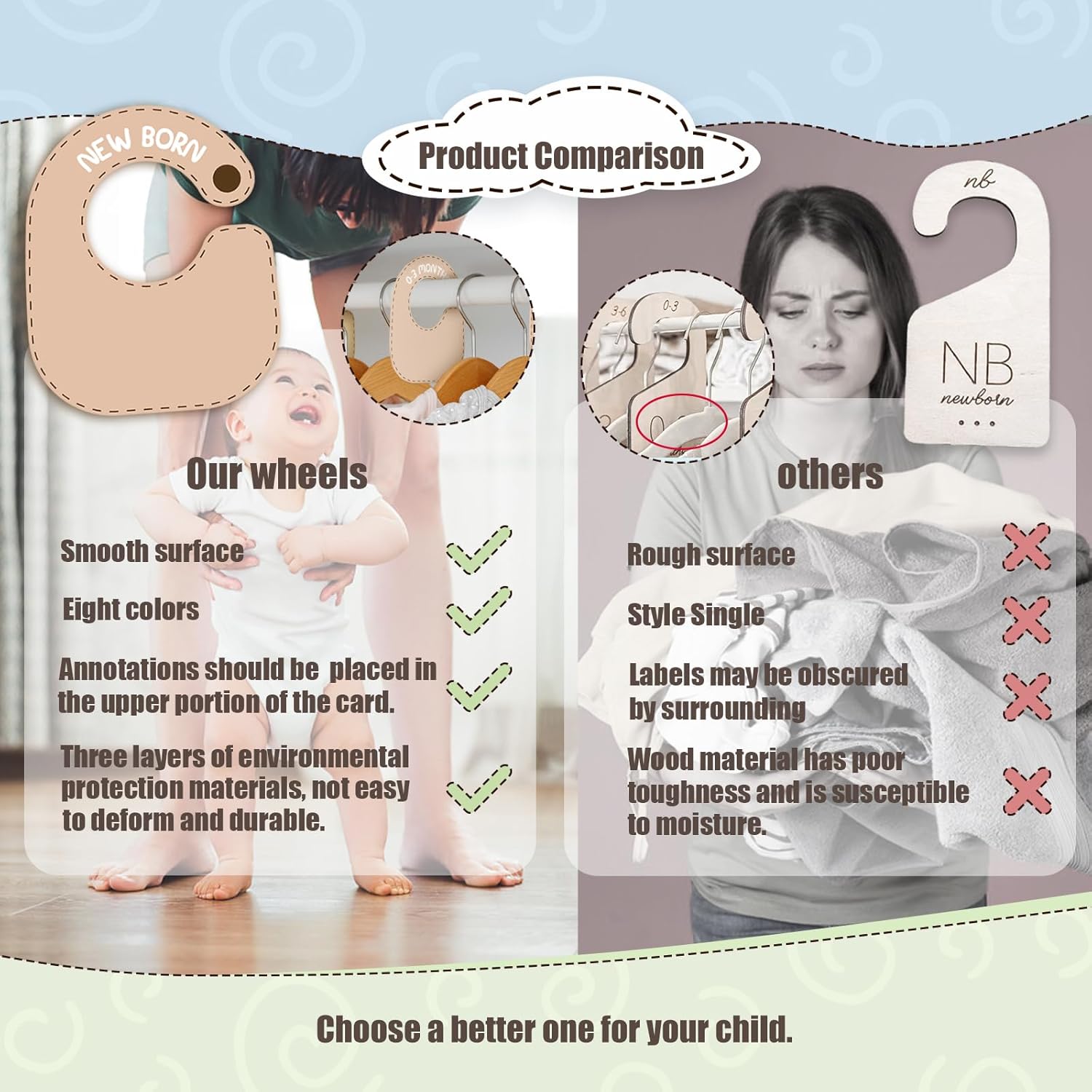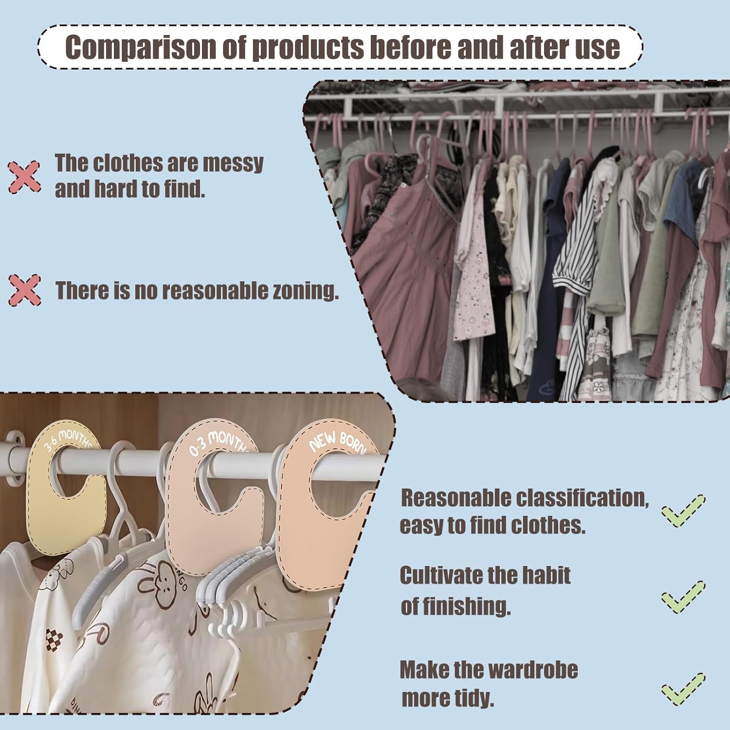 - ăEasily Divide Baby Clothesă With clear, easy-to-read labels for different sizes and types of clothing, these 8 pack of baby closet dividers make it simple to organize and locate your baby's outfits at a glance. The baby clothes hanger dividers enhanced clarity. Each baby dividers for closet includes dividers for baby age ranges and clothing sizes, from newborn to toddler, ensuring that as your baby grows, their closet still remains neat and orderly.