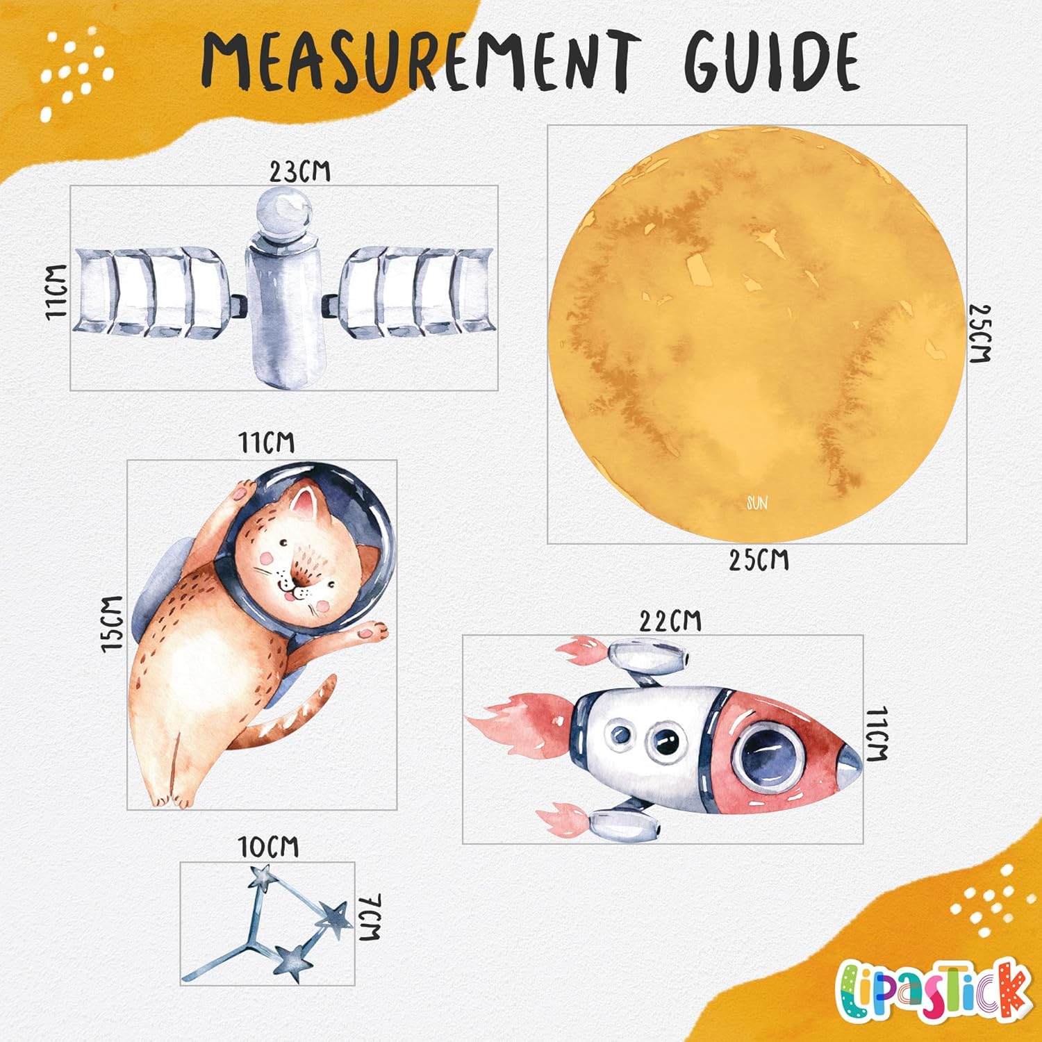 - ๐Package Content: Solar system wall decals for baby room come in a pack of 4 sheets. Includes: sun, planets, satellite, spaceship, rockets, astronaut animals, asteroids, stars and constellations. The sheet size is 13.8" x 7.8".The sheet size is 15.7" x 11.8" This set of kids wall stickers is size M.