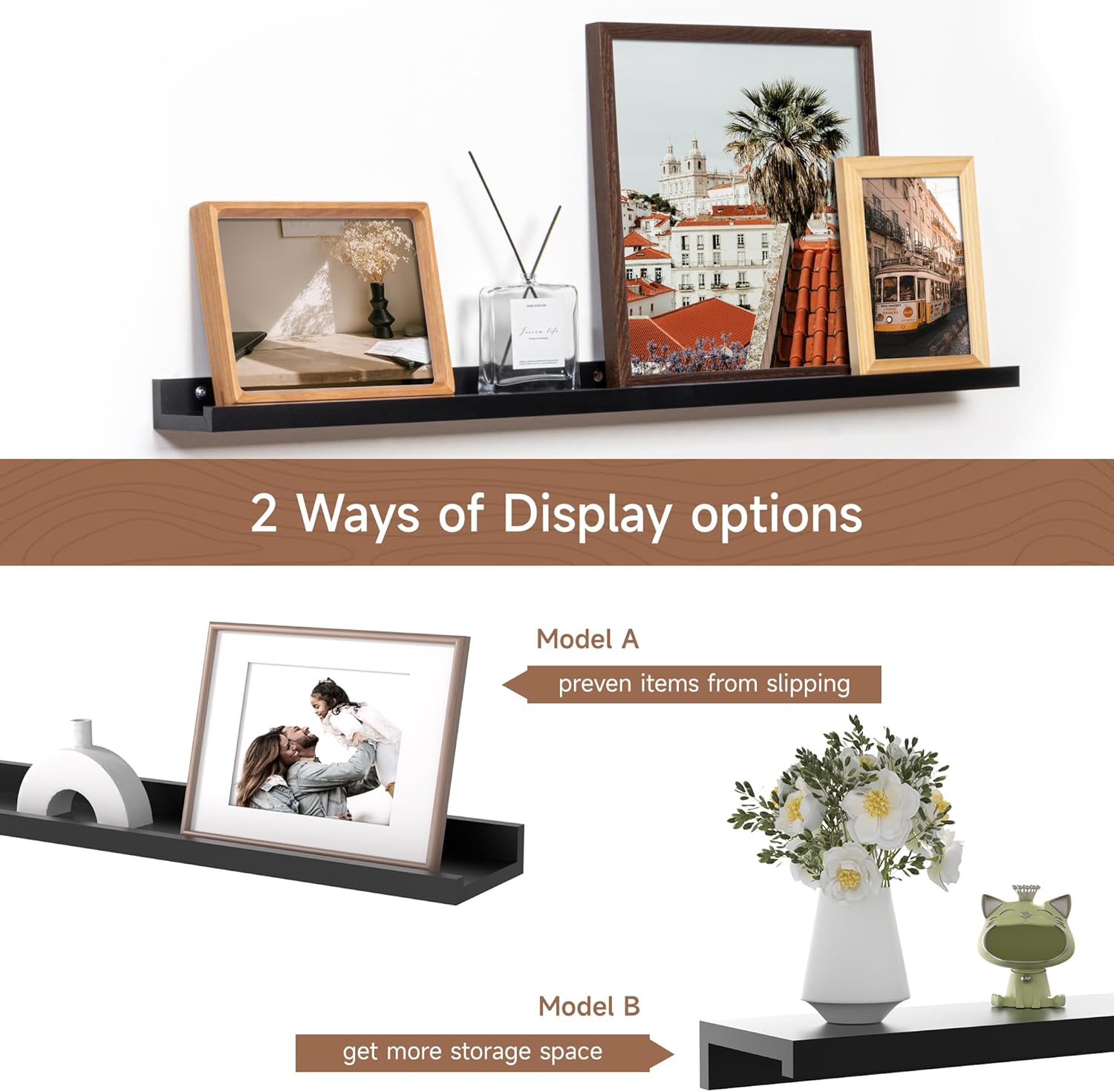 - MEMORIES SHOWCASE SHELF: Do you have a lot of memorable photos, but don't know how to display them, Fun Memories picture ledge shelves (especially in large sizes) are perfect for you to display them! With our hanging racks, you can store and display different types and sizes of photo frames in one place without worrying about