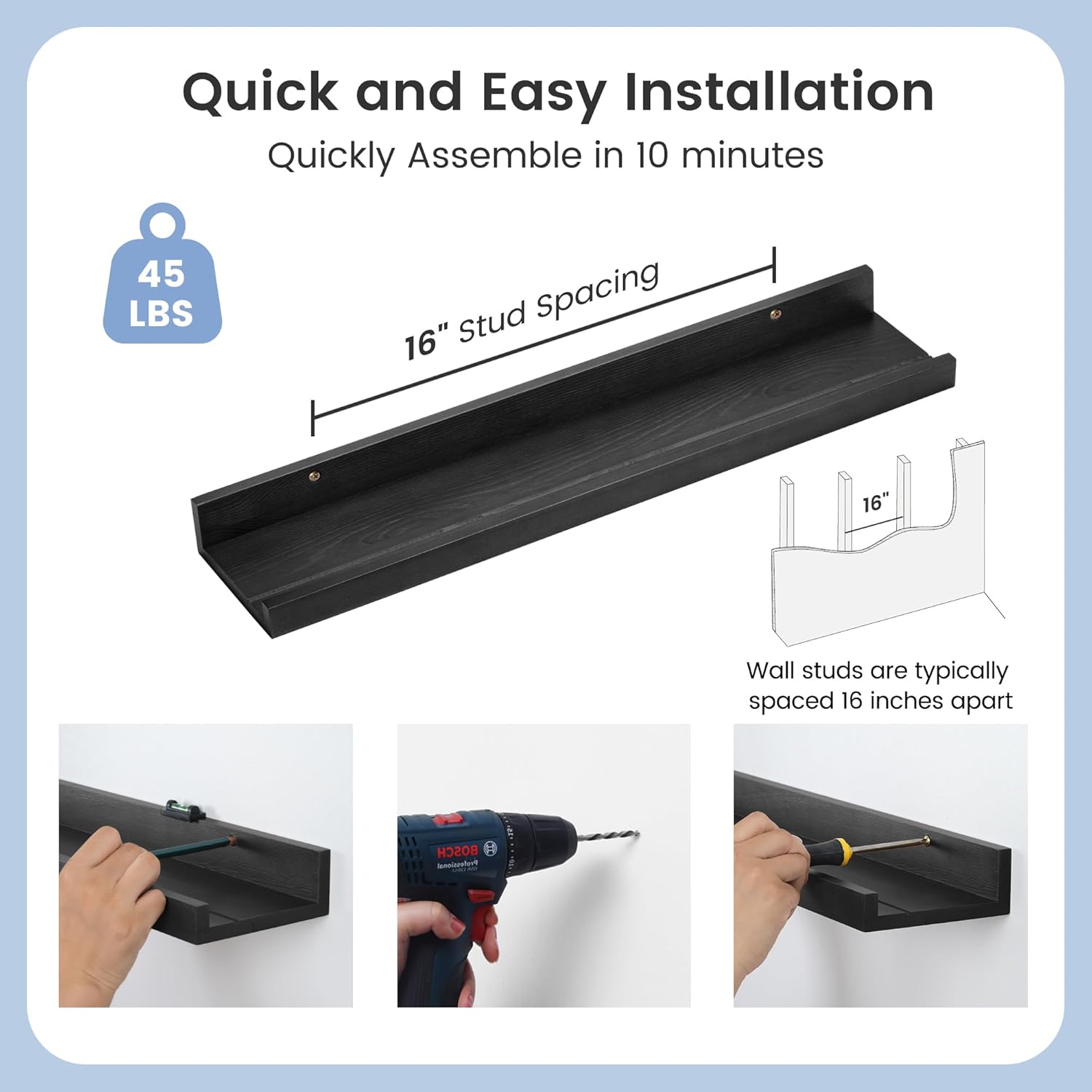 Picture Ledge Wall Shelves 24 inches Width Set of 3, Solid Pine Wood Rustic Floating Ledge Shelves for Kids' Room Bedroom Kitchen Bathroom Living Room Nursery Display Wall Decor, Black