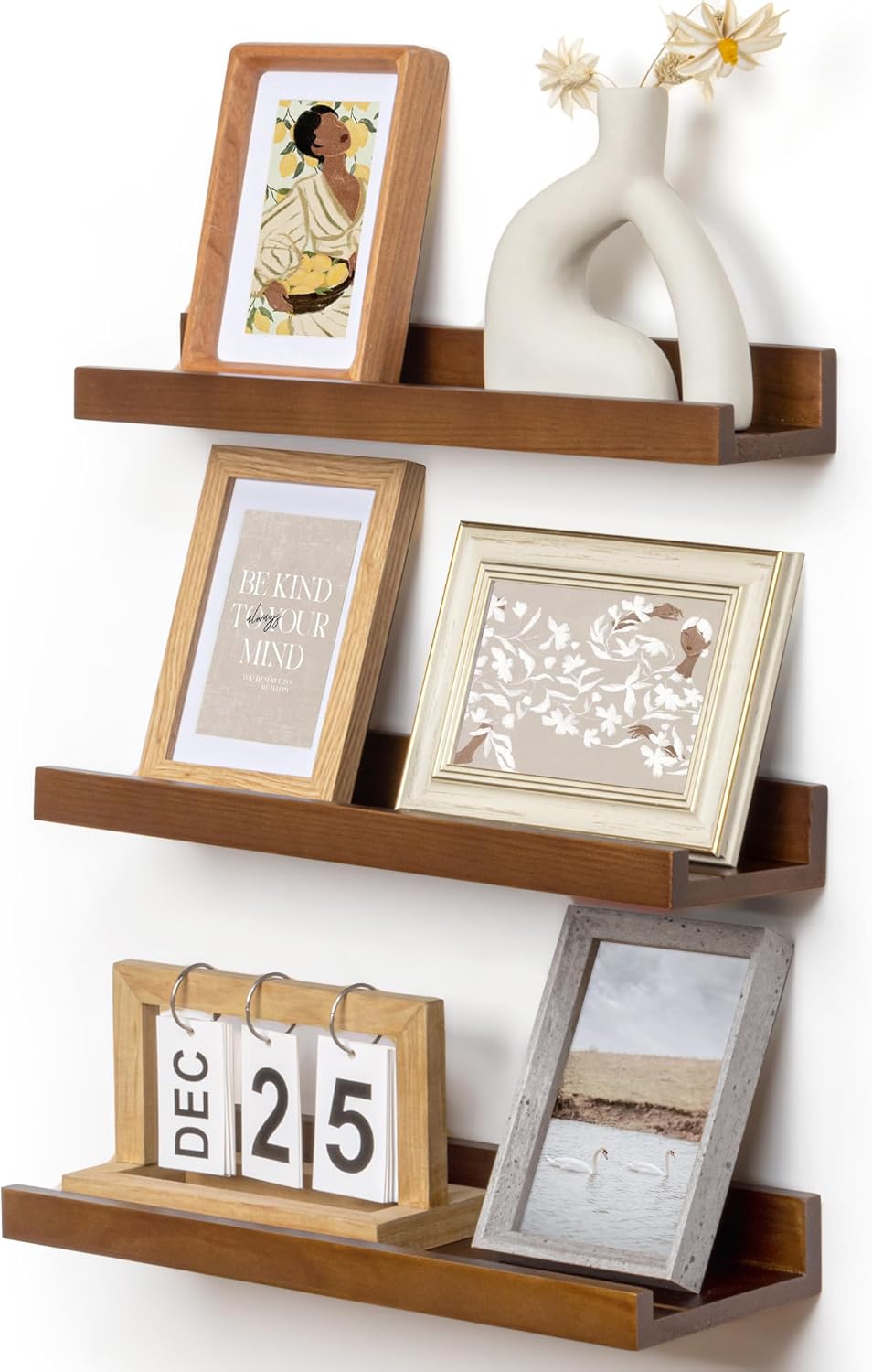 - Picture Ledge Shelves: The ledge in front of the wall shelves could prevent your precious items from falling off. And we handcraft a shallow groove on each book shelf to protect your items from sliding forward. Each floating shelf is 5 inches in depth with a 1.25 inches lip, you can put photos, pictures, DVD players, videos, books, toys, and some other knickknack on this beautiful display wooden shelf