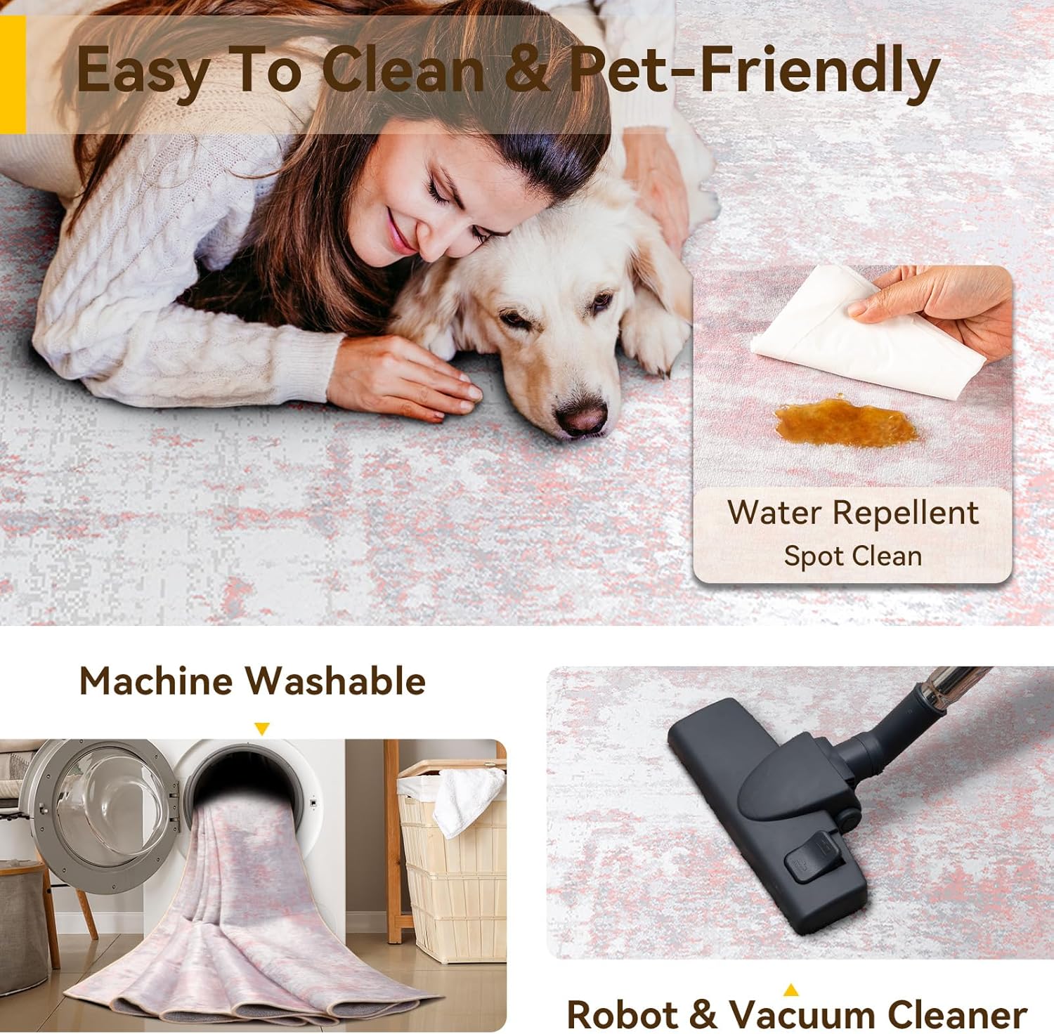 Washable Area Rugs 8ft Non-Slip Modern Abstract Soft for Living Room Entryway Bedroom Nursery, Print Pattern, Grey Pink