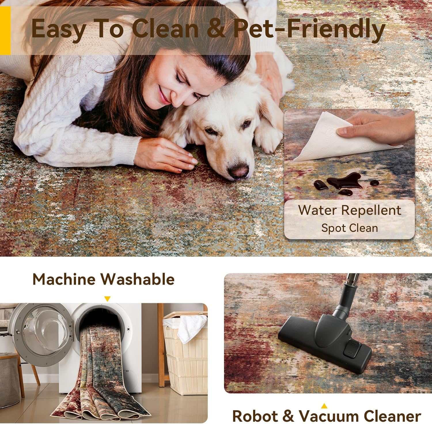 Washable Area Rugs 4'x6' Non-Slip Modern Abstract Soft for Living Room Entryway Bedroom Nursery, Print Pattern, Brown Rust Red Multi