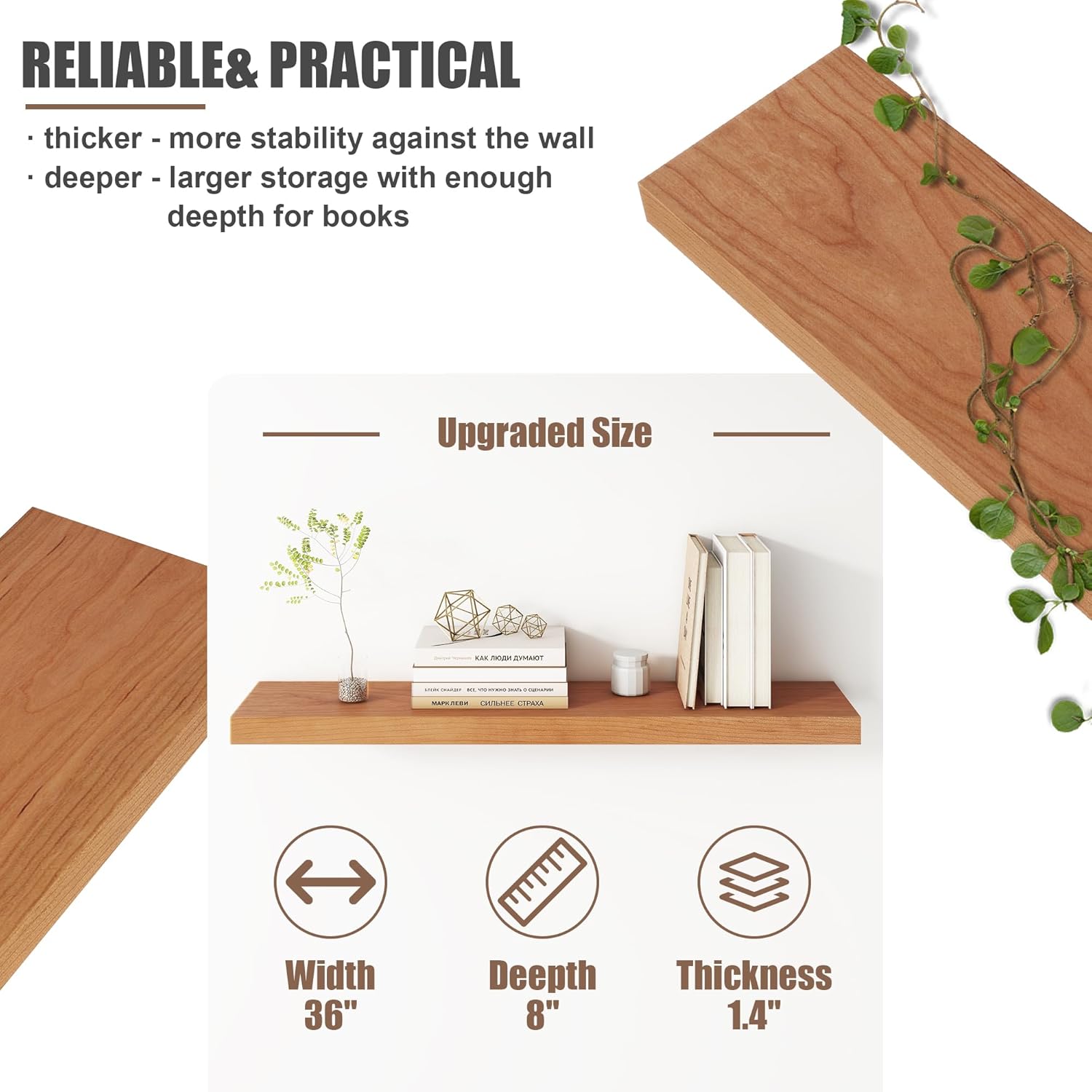 Floating Shelves for Wall, USA-Sourced Cherry Wood 36 Inch Long Wall Shelves Set of 2, Natural Wooden Wall Mounted Picture Ledge Shelf, Nursery Book Storage Shelf Kids Bookshelf, Display Shelf