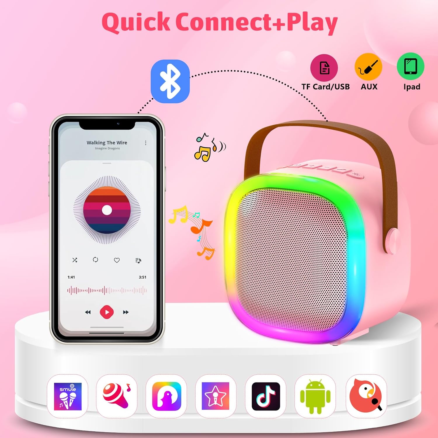 - Compact and Portable-Mini kids karaoke system is designed with a durable handle,which is lightweight, wireless and highly portable.Perfect for family gatherings, birthday party, school activities,travel etc.Ensuring endless fun and creativity for children while the colorful LED lights sync to the music, enhancing the party atmosphere