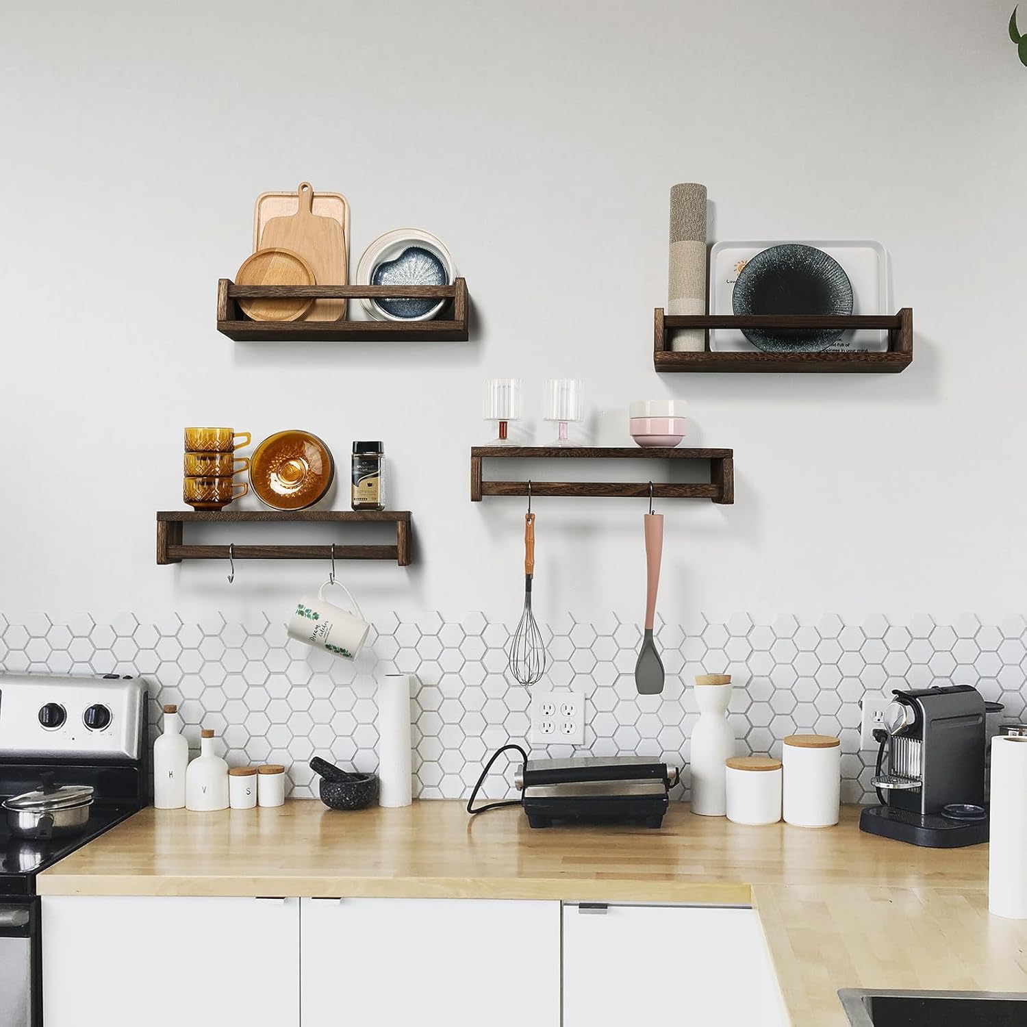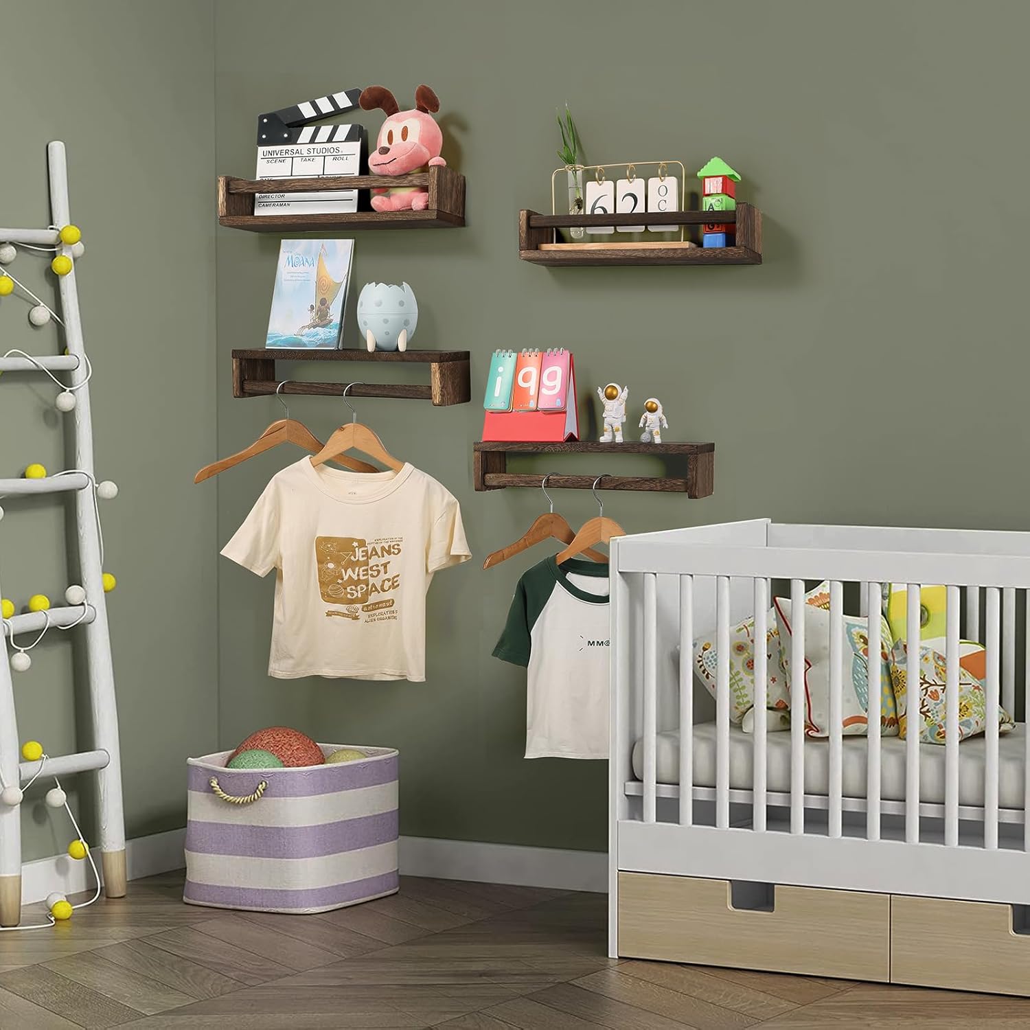 Nursery Room Shelves Set of 4, Wood Floating Book Shelves for Kids Room, Baby Book Shelf for Nursery, Kitchen Spice Rack (Carbonized Brown)