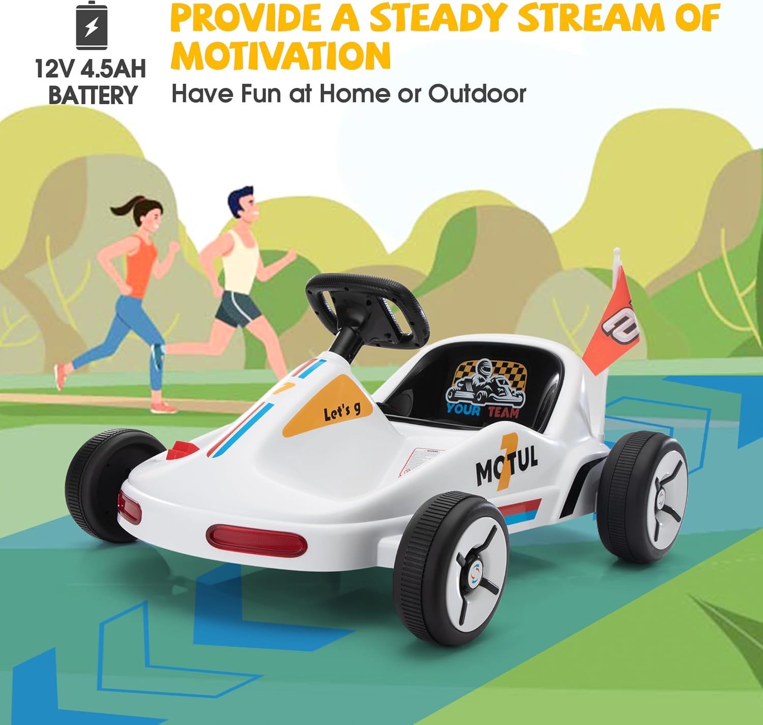 TOBBI 12V Electric Go Kart for Kids Battery Powered Ride on Car Outdoor Race Toy with Remote Control, Safety Belt, Music, LED Lights and Flags for Toddlers 3-8 Years, White