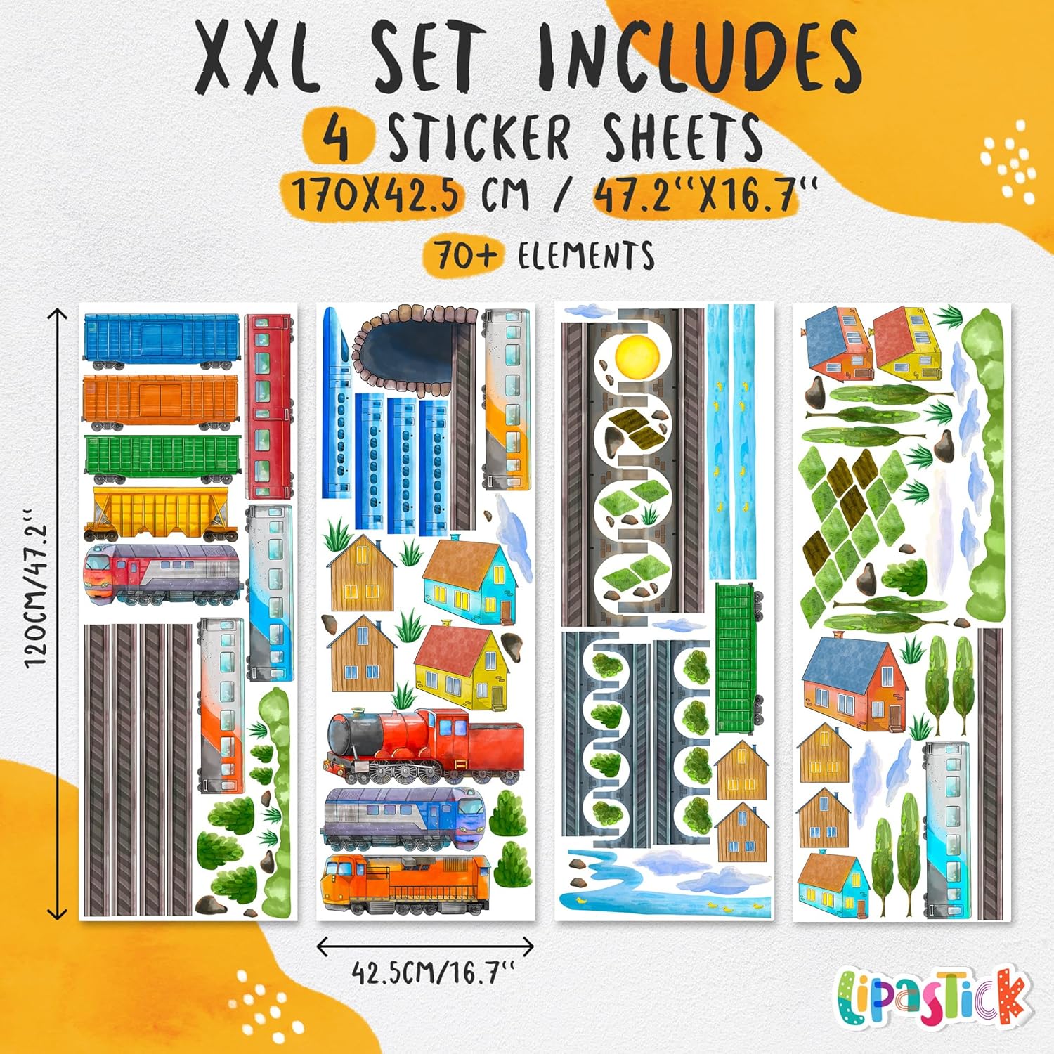 - β Instantly bring a boring wall to life with this nursery decor for kids' rooms, featuring a variety of locomotive, tube, carriage, train, bridge and railway stickers. Train wall decals come in a pack of 4 sheets. This set of stickers is size XXL and its size on the wall is 157"" x 98"