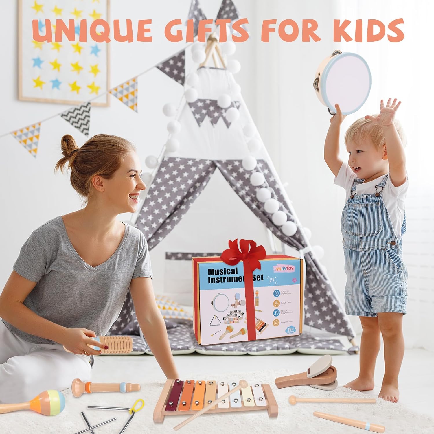 - 8 IN 1 BABY MUSICAL INSTRUMENTS SET: YHHYTOY toddler musical toys are specially designed for kids who love music. The set includes 1* xylophone 1* tambourine 1* traingle 1* wood sounder 1* clarinet 2* maracas 2* claps 2* hand bells, enabling your little musician to make different sounds