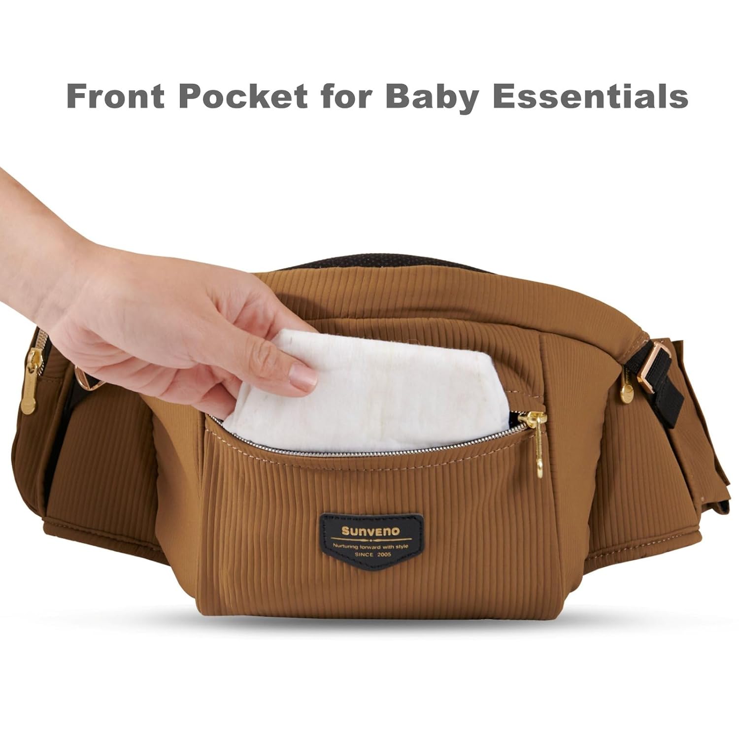 SUNVENO Baby Hip Carrier with Hip Seat, CPC-Certified, Ergonomic Infant Carrier for Newborns & Toddlers up to 45 lbs, Adjustable Waistband, Multiple Pockets, All-Season, Brown