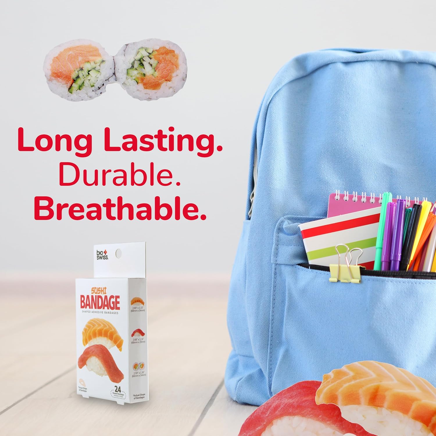 - SUSHI BANDAGES: This 24 piece pack of Sushi shaped bandages features 3 fun sushi shapes, and is great for putting a smile on kids' faces while protecting wounds such as cuts, scrapes, and burns; sticky bandages come in a cute cardboard box and are perfect for kids and adults alike, and also for school nurses and pediatric doctors