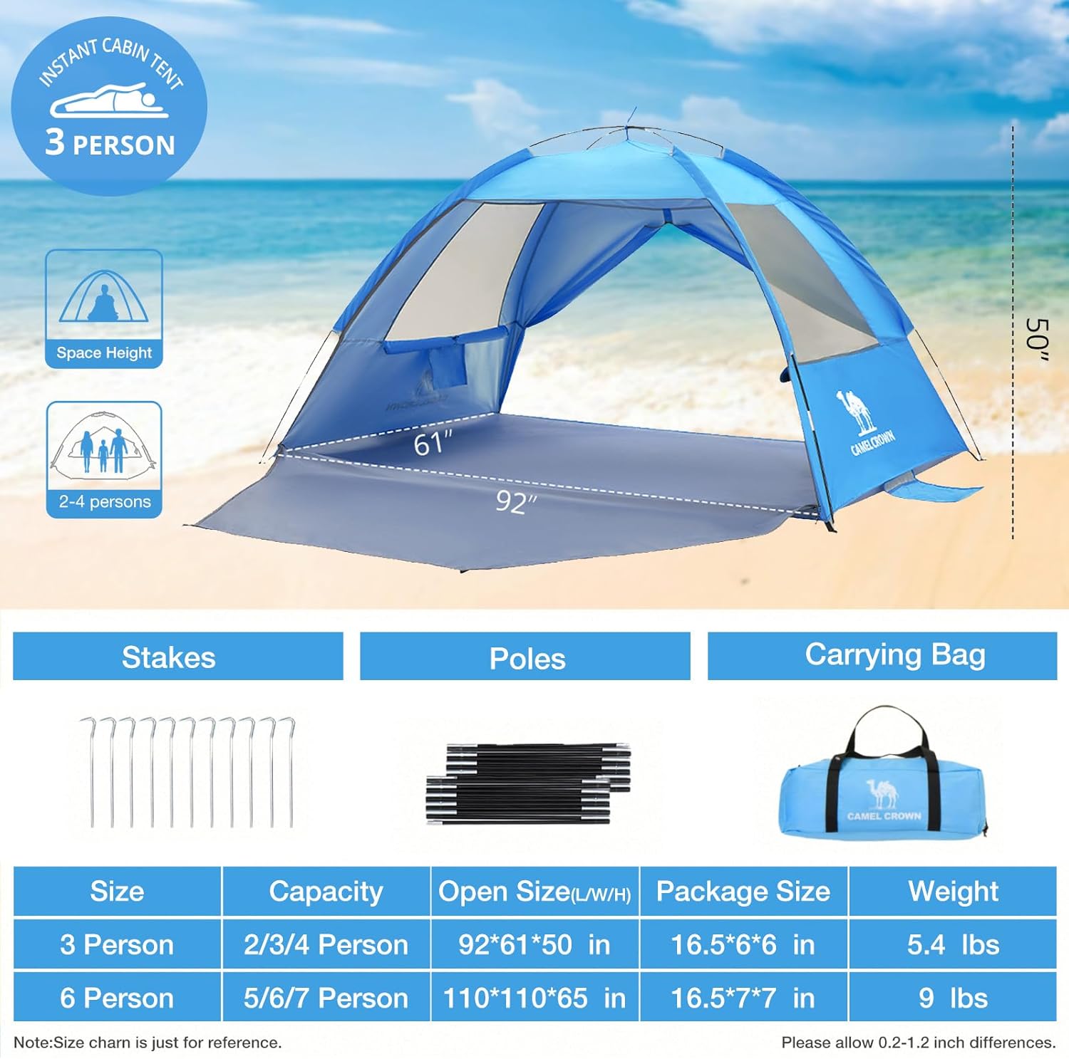 CAMEL CROWN Beach Tent UPF 50+ Sun Shelter for 2/3/5/6 Person, Lightweight Portable Sun Shade with Sand Anchor, Family Beach Day & Outdoor Adventures