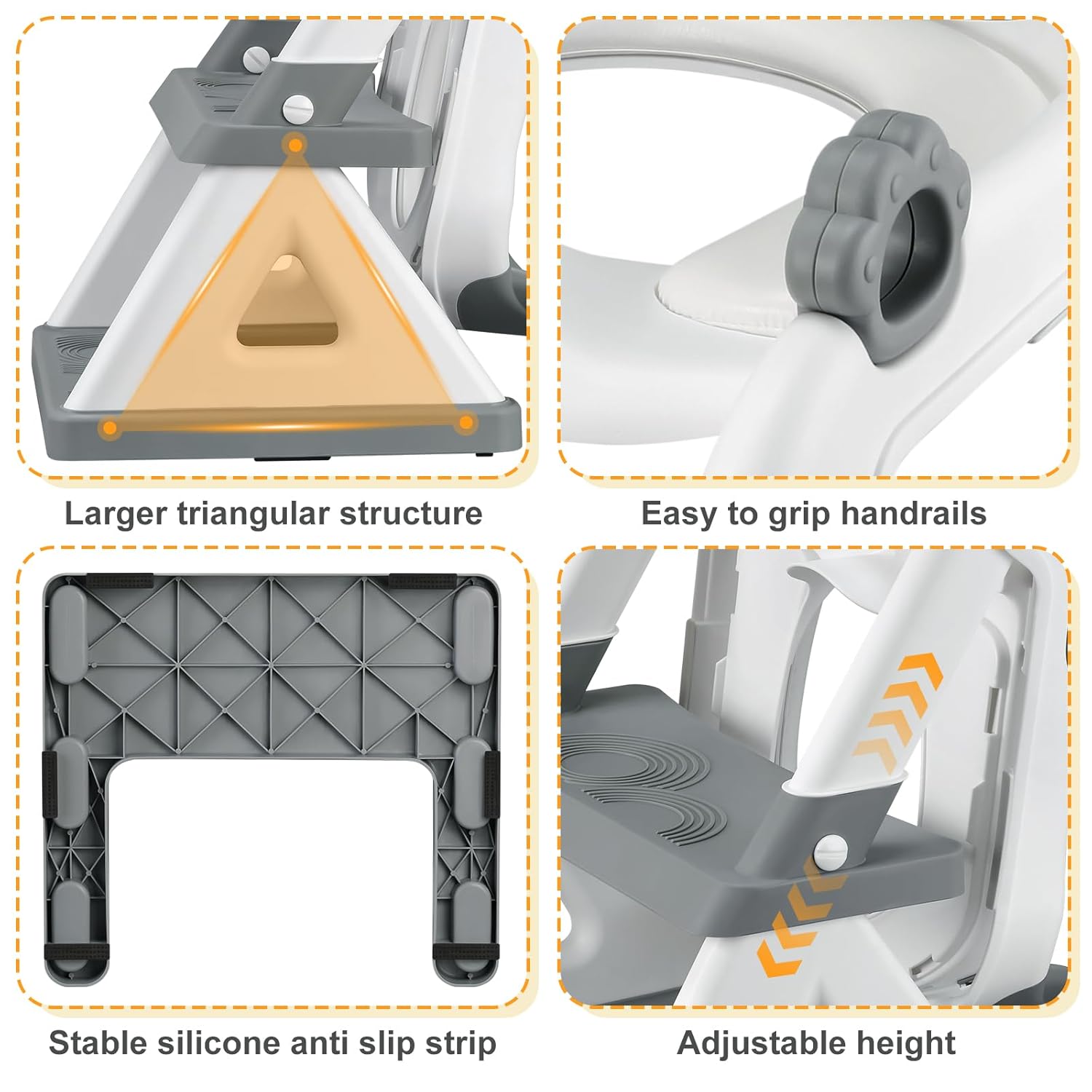 - Stable Triangular Structure:Our latest toilet step stool with a upgrade triangular structure that is more stable than ever before. The seat's base features a 6-point anti-slip mechanism for steadfastness,offering ample space and safety for climbing, meffectively addressing common issues of seat wobbling. Anti slip handrails make it easier for children to climb.