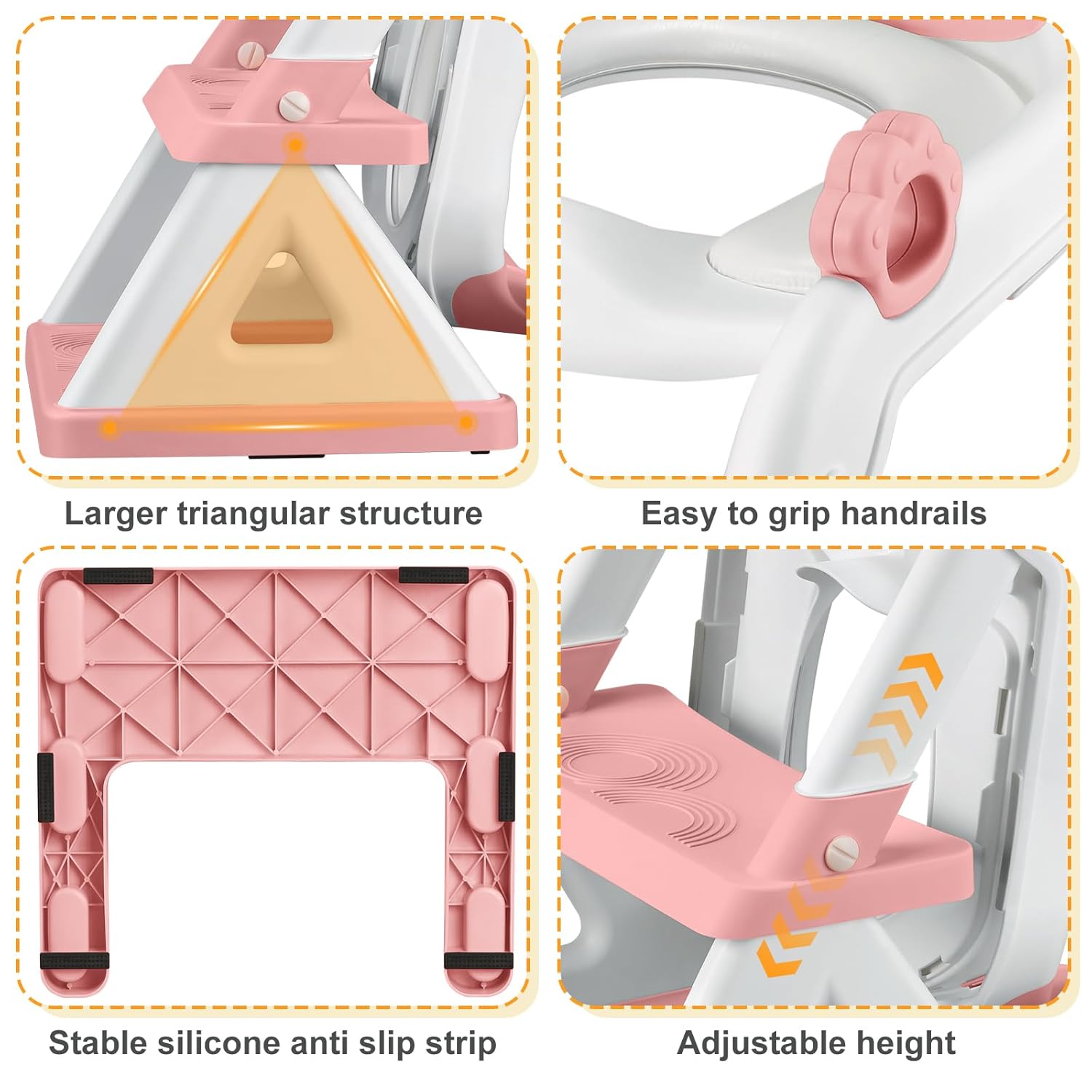 - Stable Triangular Structure:Our latest toilet step stool with a upgrade triangular structure that is more stable than ever before. The seat's base features a 6-point anti-slip mechanism for steadfastness,offering ample space and safety for climbing, meffectively addressing common issues of seat wobbling. Anti slip handrails make it easier for children to climb.