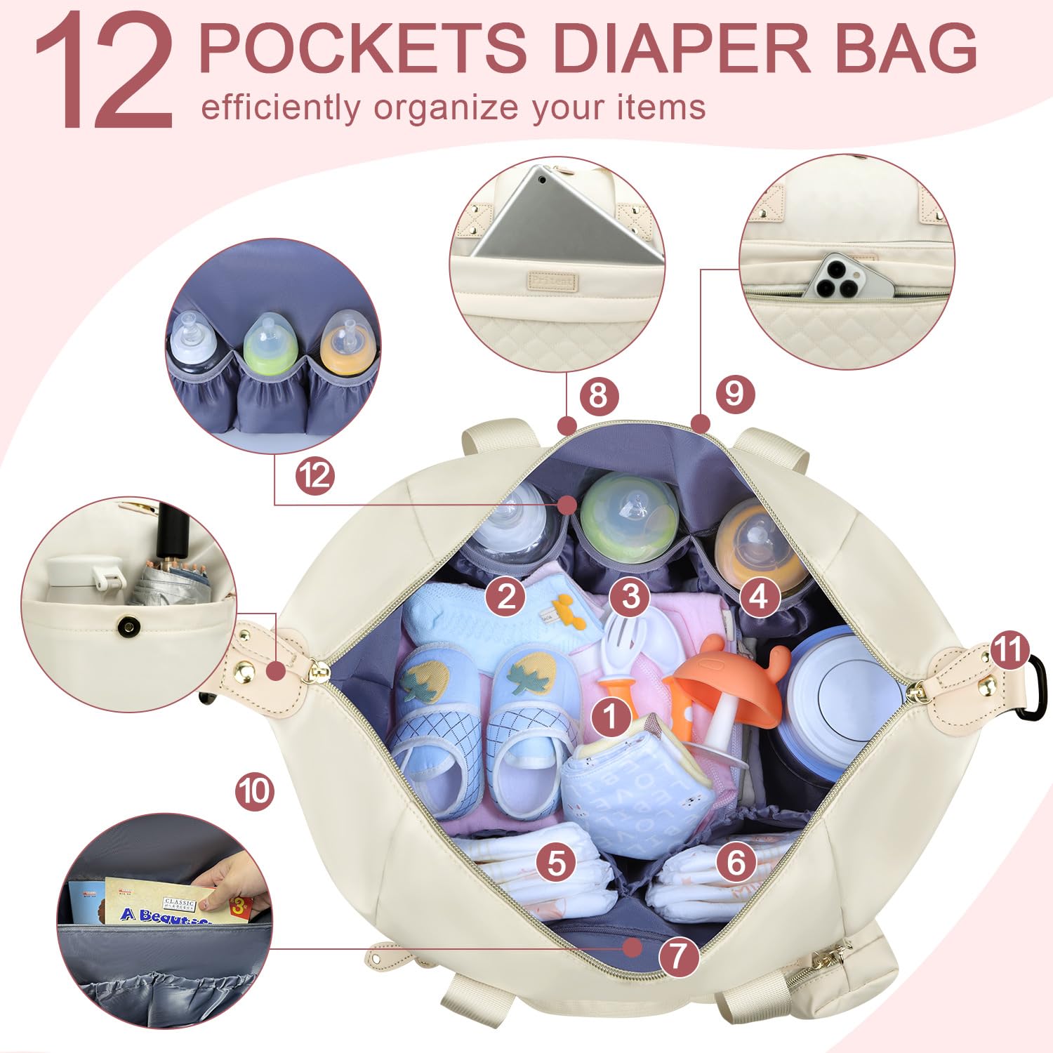 - All in One Diaper Baby Bag: Designed with multiple specialized pockets, pacifier case and easy-to-reach bottle compartments, Pritent diaper bag tote can also function as a hospital overnight maternity bag for labor and delivery, travel tote bag, stroller organization, crossbody / messenger bag, handbag.