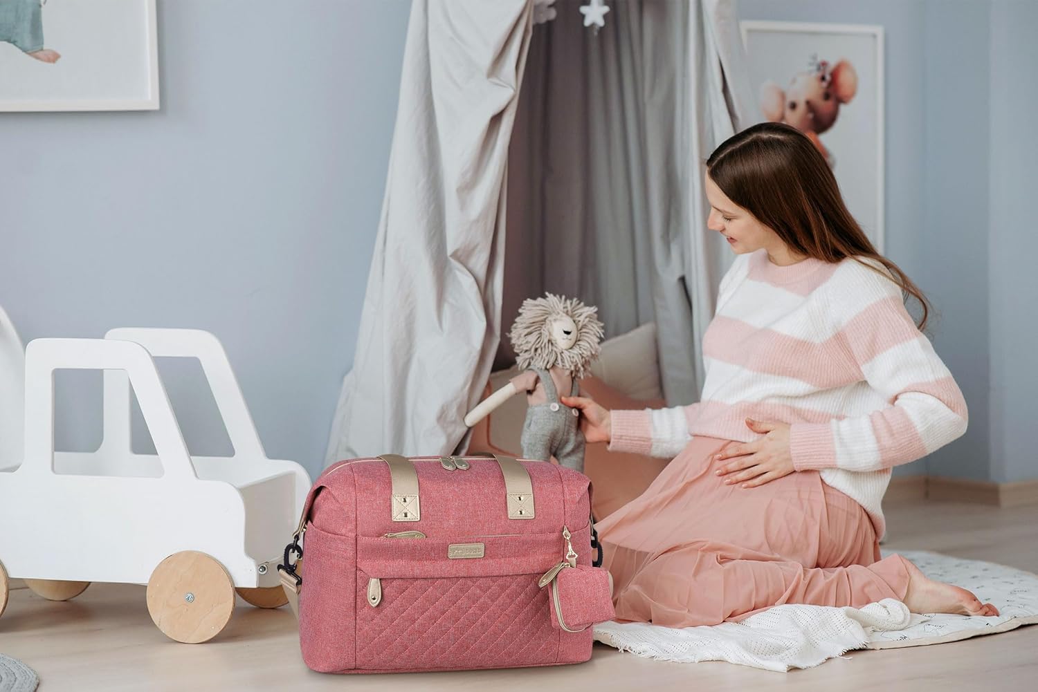 Diaper Tote, Baby Bags with Pacifier Case, Shoulder Straps, Stroller Clips, Waterproof Mommy Bag - Medium, Pink