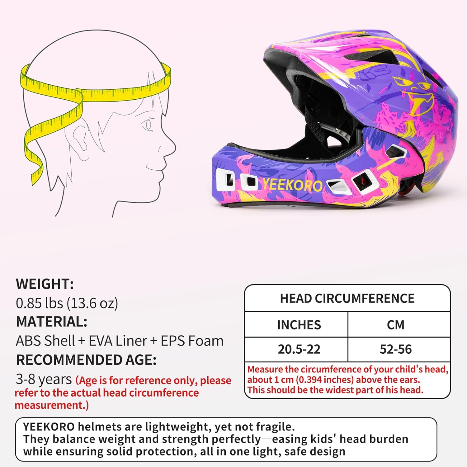 - FULL FACE PROTECTION SYSTEM: YEEKORO children's full face bike helmet is a unique blend of hard ABS shell and advanced EPS crash-proof material, with well-designed chin protection, which together builds a multiple defense system. Whether riding off-road or on the highway, your child will be provided with comprehensive safety protection, effectively resisting injuries caused by strong impacts and guarding every moment of adventure