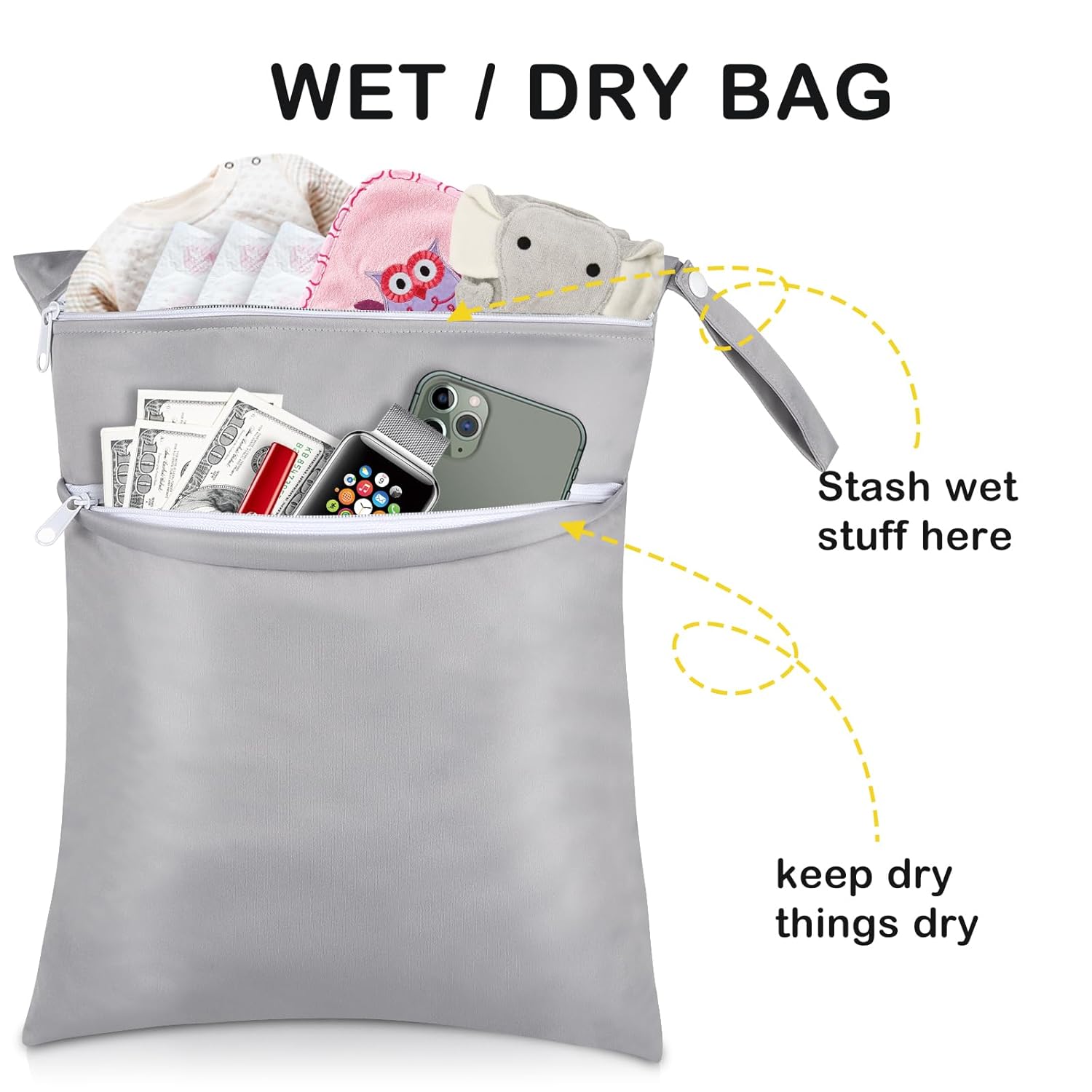 - Come with TWO zip closures to ensure that nothing will drop out of the bag and keep the clean and dirty diapers separately. Also comes with durable handle for easy carrying or attaching to your diaper bag or stroller.