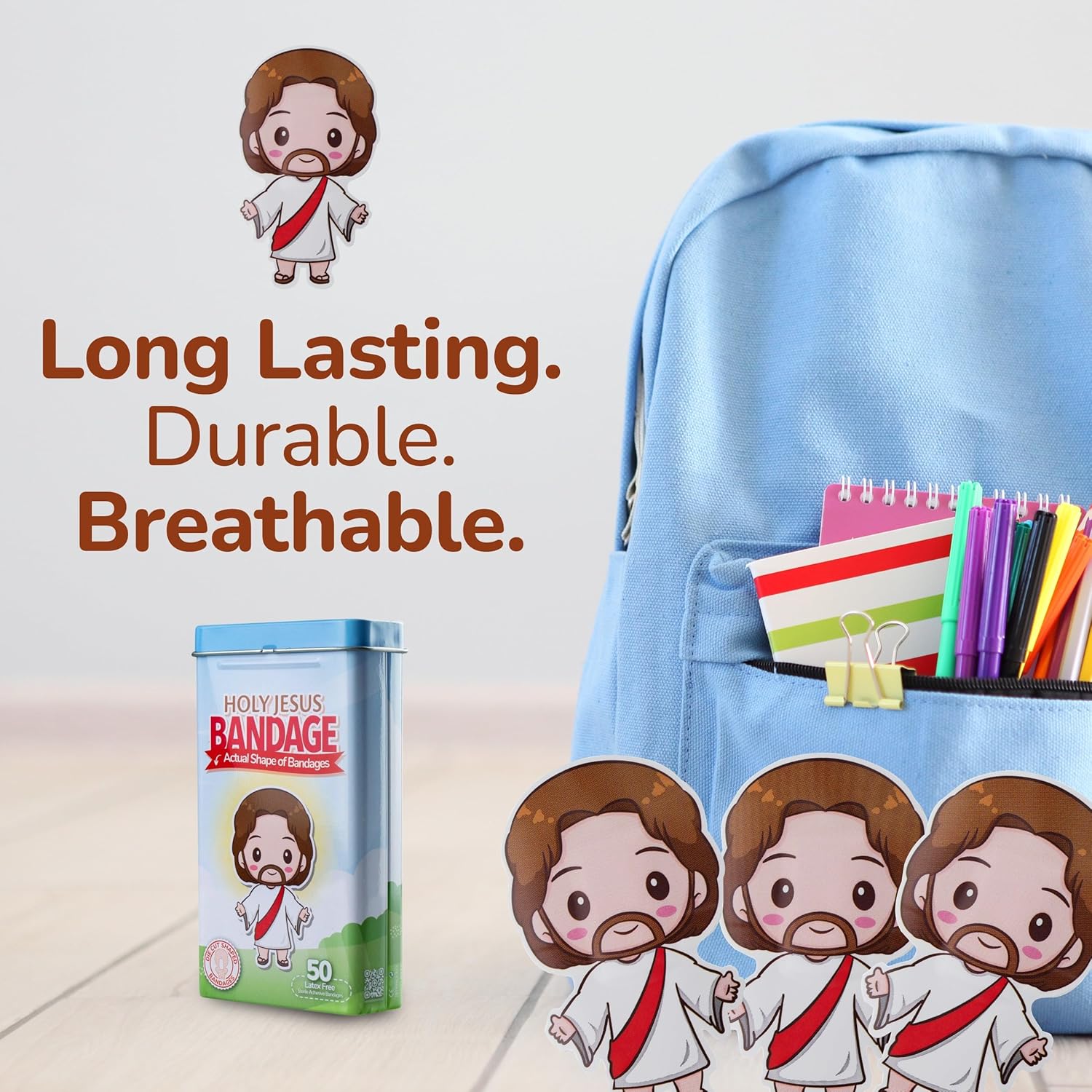- HOLY JESUS BANDAGES: This 50 piece tin of Jesus shaped bandages is great for putting a smile on kids' faces while protecting wounds such as cuts, scrapes, and burns; sticky bandages come in a cute tin and are perfect for kids and adults alike, and also for school nurses and pediatric doctors