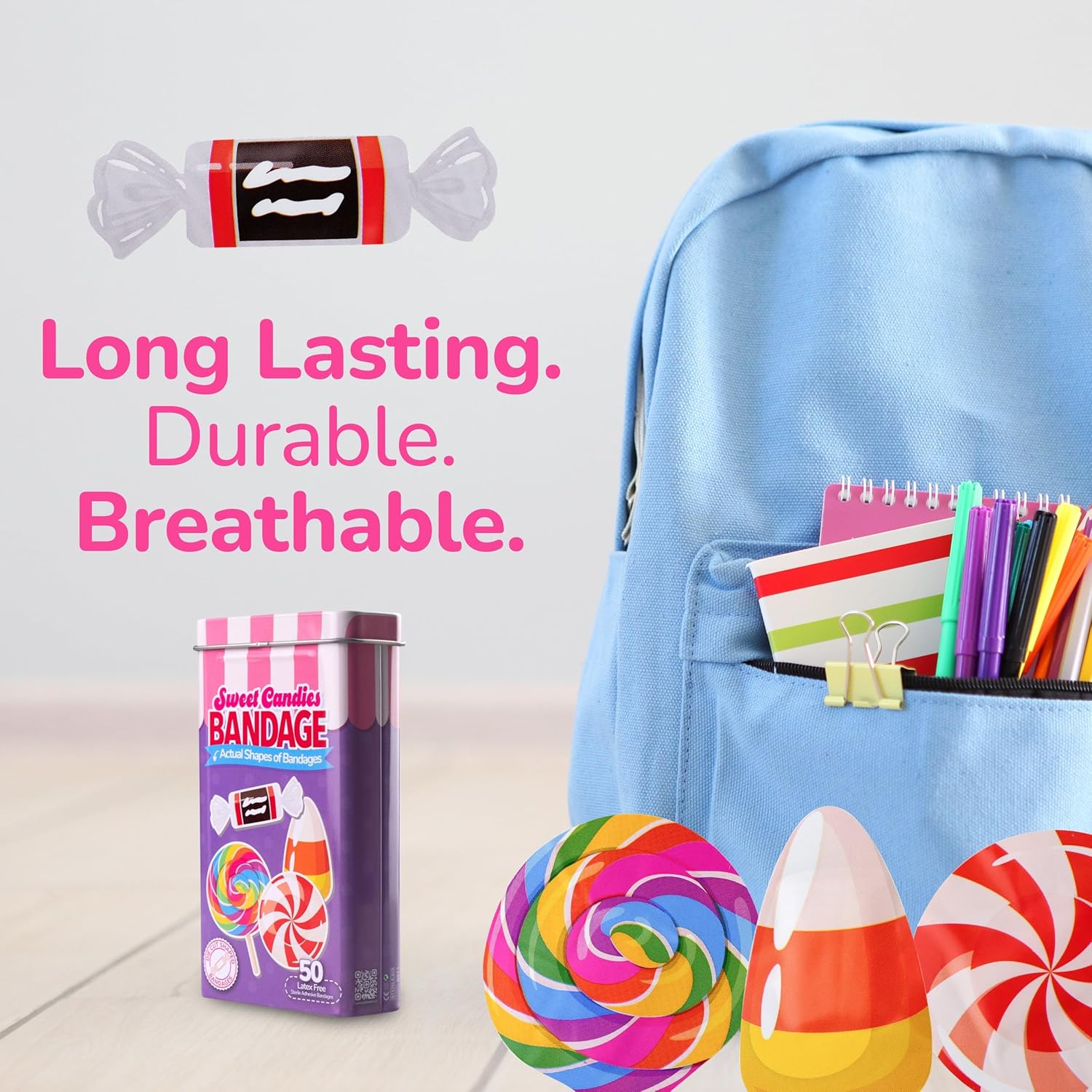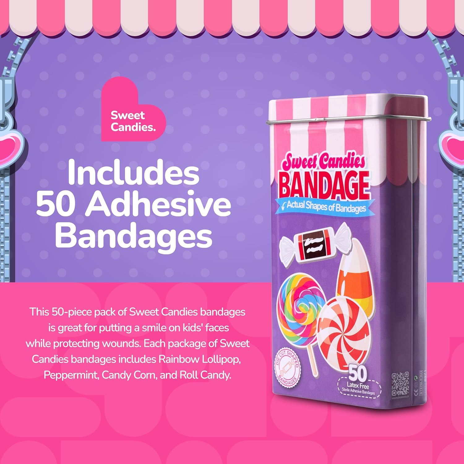 - SWEET CANDIES BANDAGES: This 50 piece tin of candy shaped bandages features 4 fun candy shapes (lolipop, peppermint, candy corn, and roll candy), and is great for putting a smile on kids' faces while protecting wounds such as cuts, scrapes, and burns; sticky bandages come in a cute tin and are perfect for kids and adults alike, and also for school nurses and pediatric doctors