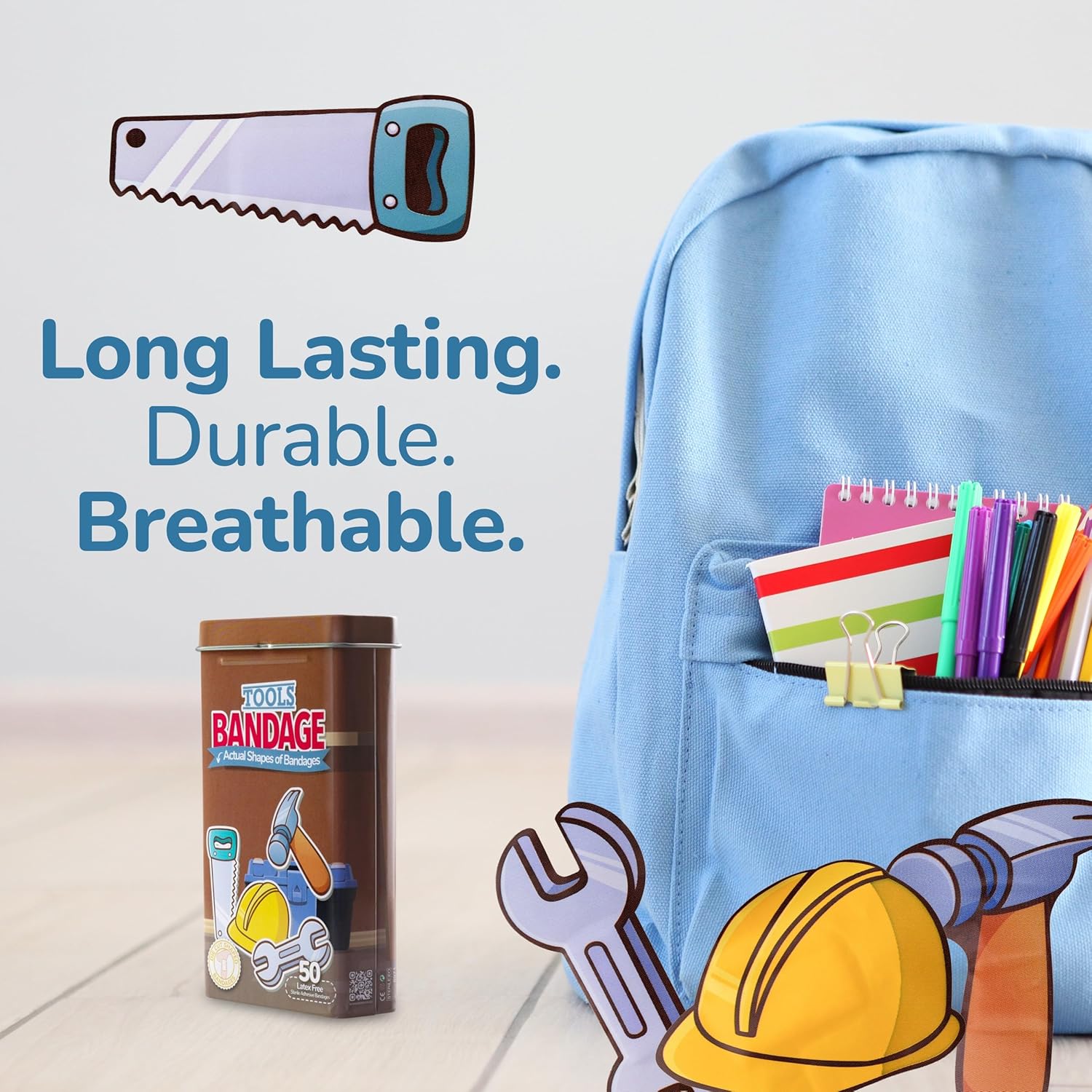 - TOOLS BANDAGES: This 50 piece tin of tool shaped bandages features 4 fun tool shapes (hard hat, saw, wrench, and hammer), and is great for putting a smile on kids' faces while protecting wounds such as cuts, scrapes, and burns; sticky bandages come in a cute tin and are perfect for kids and adults alike, and also for school nurses and pediatric doctors