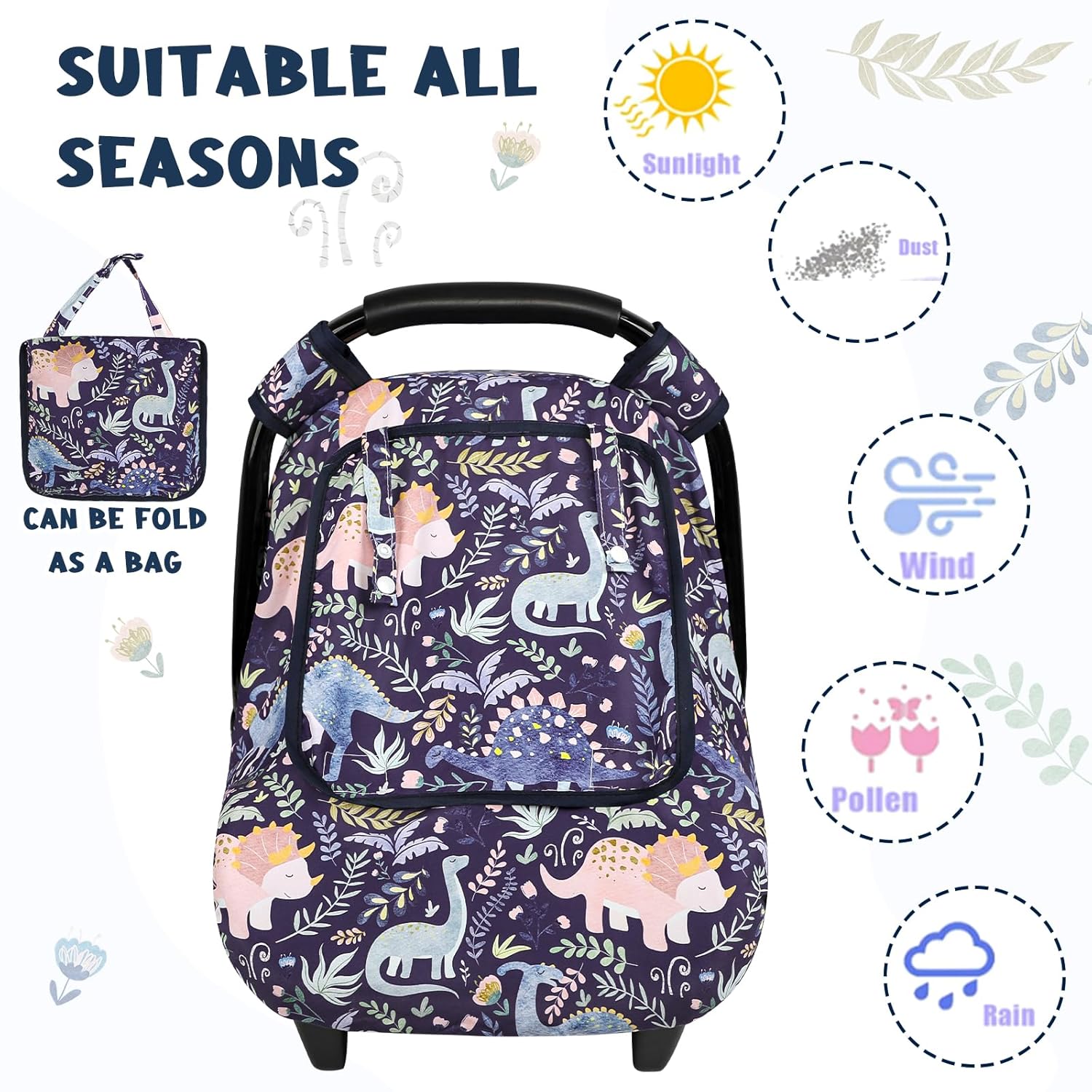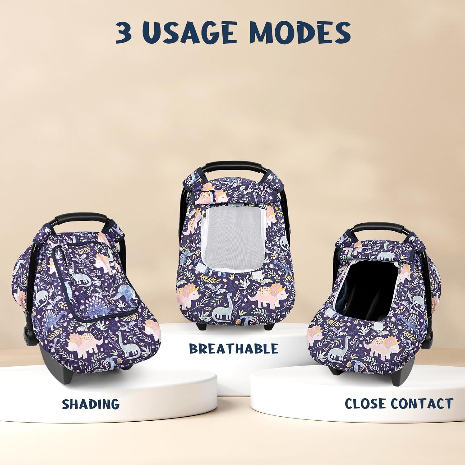 Pea Pod Car Seat Cover Baby, Infant Car Seat Canopy Covers for Newborn with 2 Layers Windows of Breathable Mesh Fabric, Lightweight Polyester/Soft Minky Dot Backing (Dinosaur)