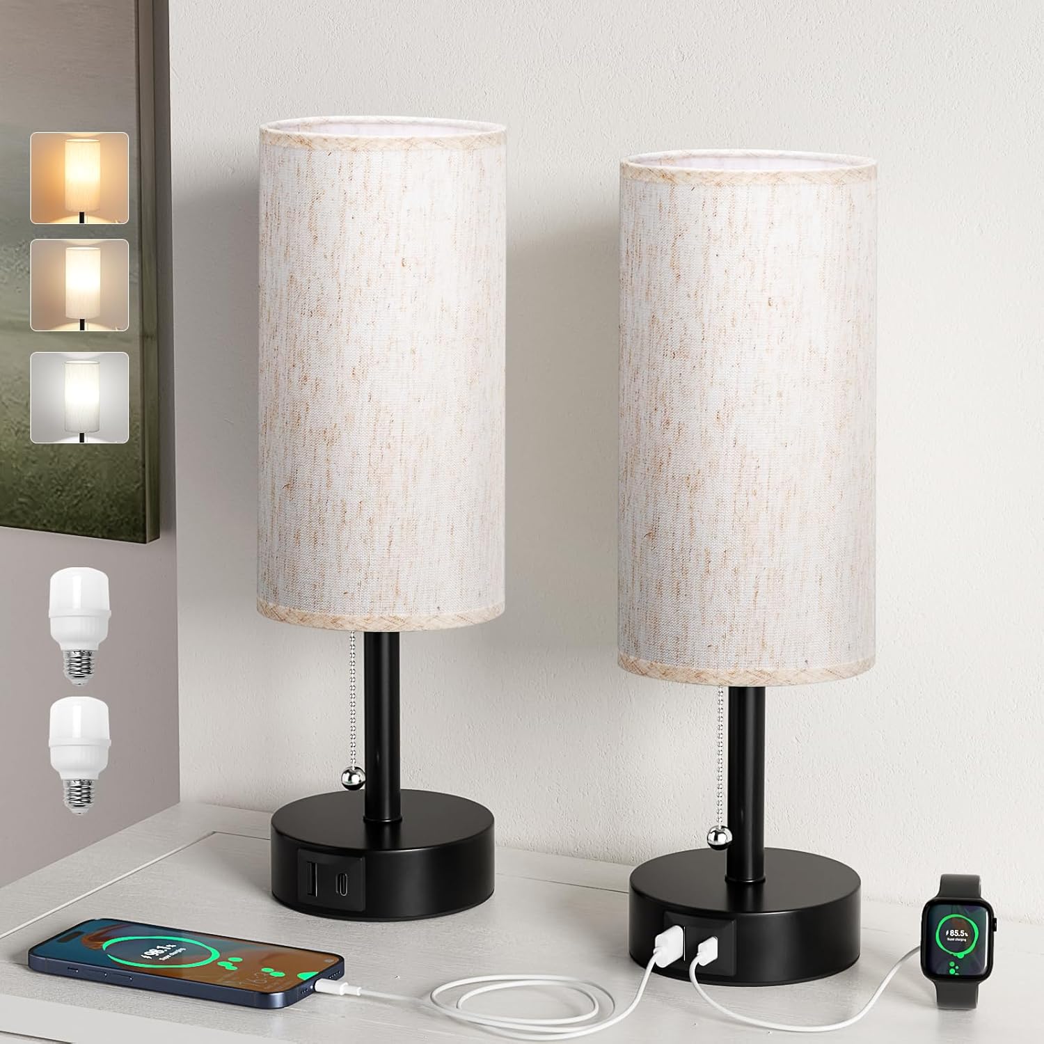 USB Bedside Table Lamps Set of 2-3 Color Temperatures Pull Chain Lamp with USB C and A Charging Ports, Round Night Stand Lamps for Bedroom
