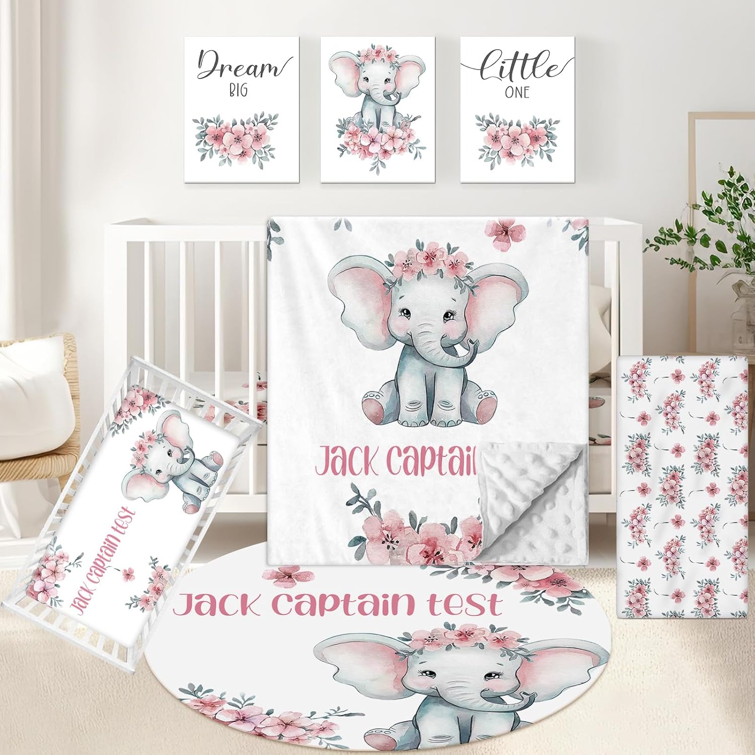 Personalized Nursery Bedding Set, 5 Pcs Custom Crib Sets, Soft Baby Girl Set with Name, Double Layer Elephant Infant Bedding Set Customized Gifts for Toddlers