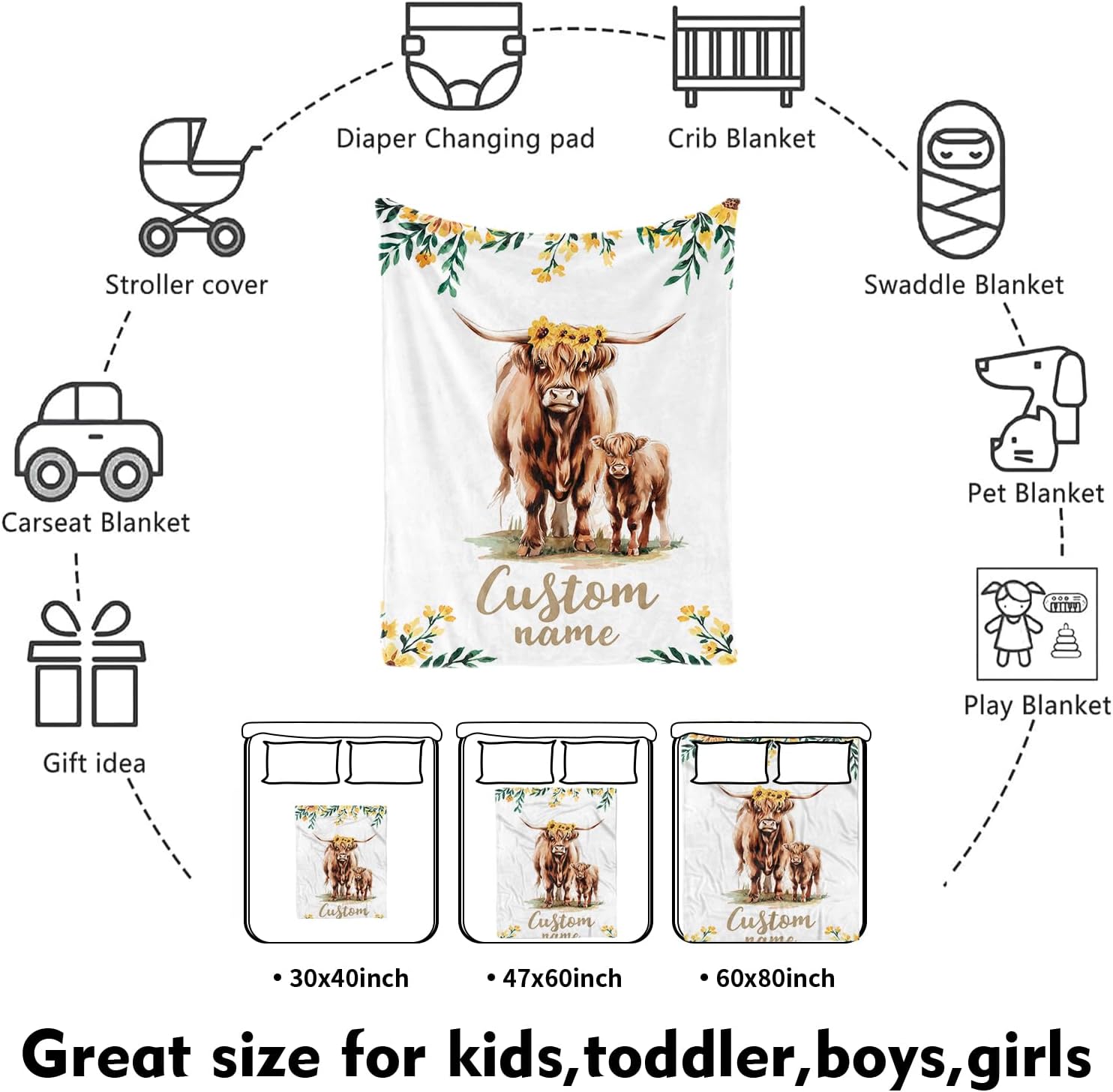 Custom Nursery Crib Bedding Set: Personalized Name 4 Piece Yellow Highland Cattle Design Baby Crib Sets for Girls - Toddler Double Layer Blanket Set, Comfortable Crib Bed Sheets for Baby Toddlers