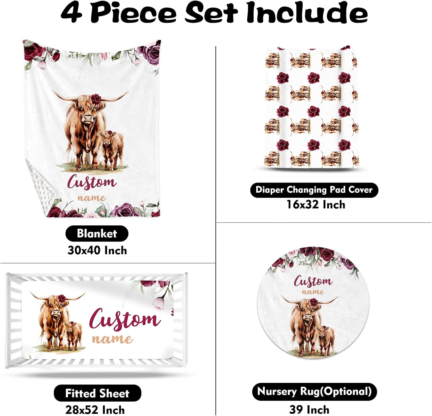 Custom Nursery Crib Bedding Set: Personalized Name 4 Piece Rose Highland Cow Design Baby Crib Sets for Girls - Toddler Double Layer Blanket Set, Comfortable Crib Bed Sheets for Baby Toddlers