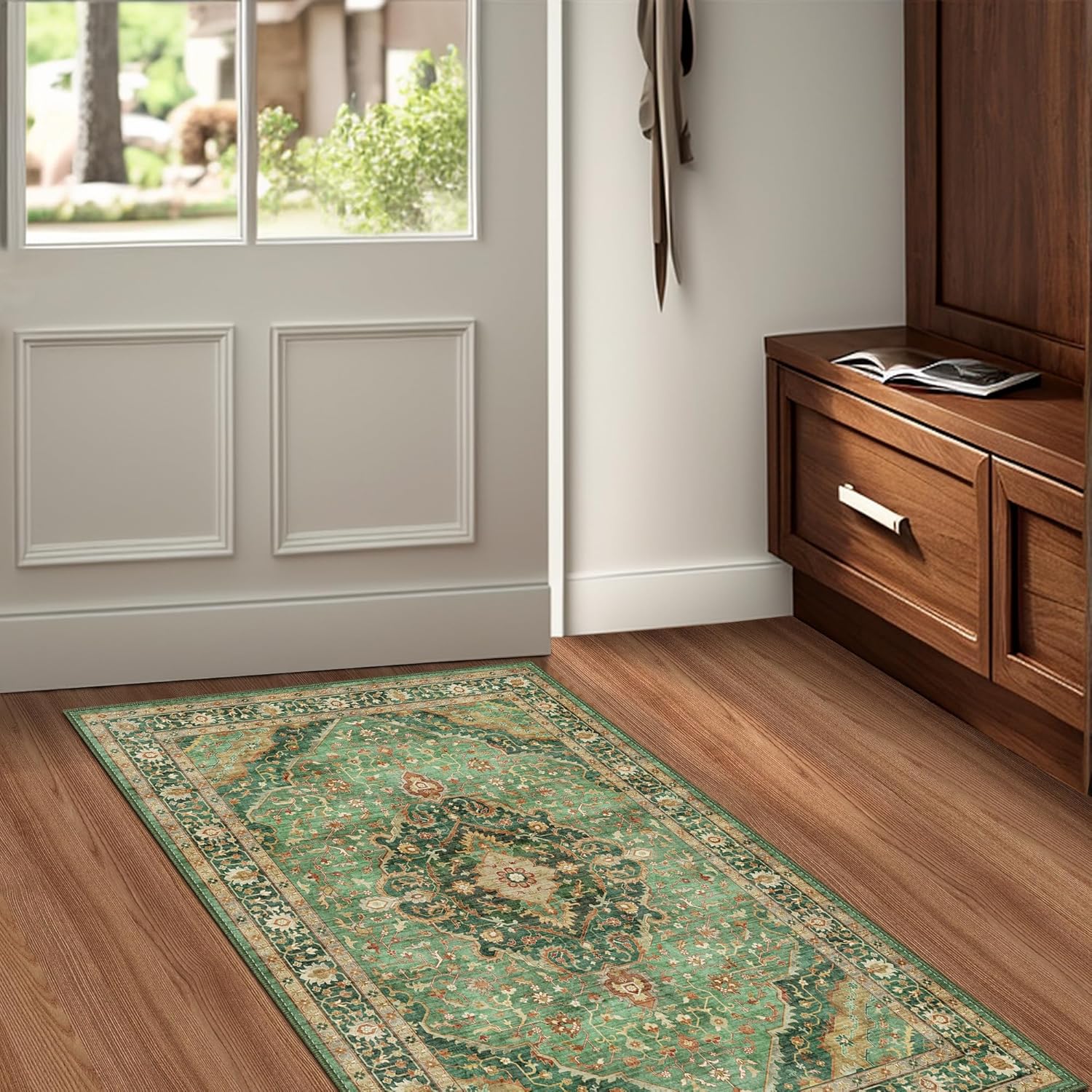 Green Runner Rug 2x4 Rugs Boho Small Washable Runner Rugs for Entryway Bathroom Kitchen, Small Rugs Soft Low Pile Non-Slip Rubber Backing Oriental Door Mat