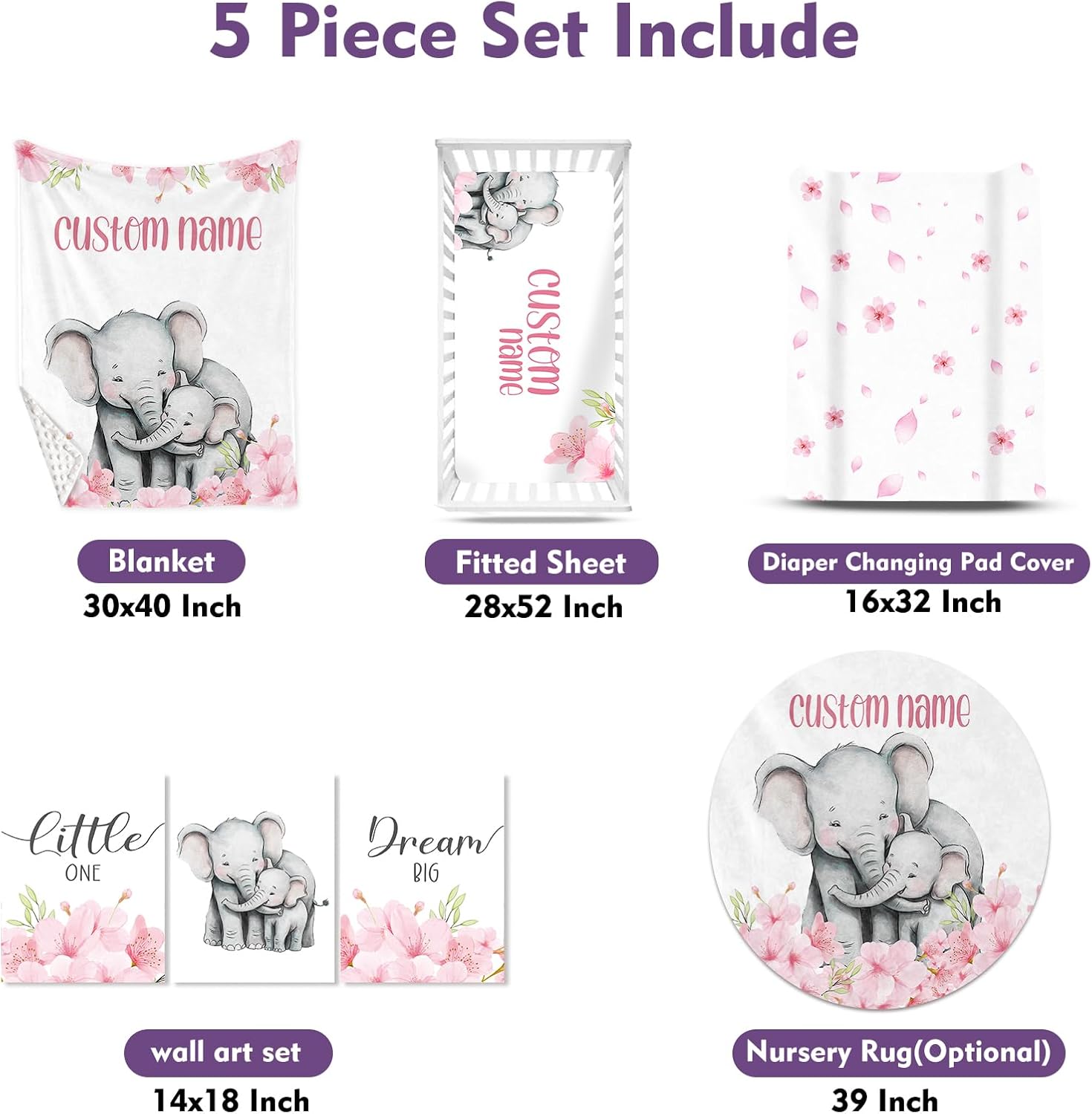 Personalized Baby Crib Bedding Set for Baby Girls, Pink Flower Elephant Design Custom Name Baby Crib Sets 5-Pcs, Toddler Double Layer Blanket Fitted Sheets Changing Pad Cover Rug Wall Art Set