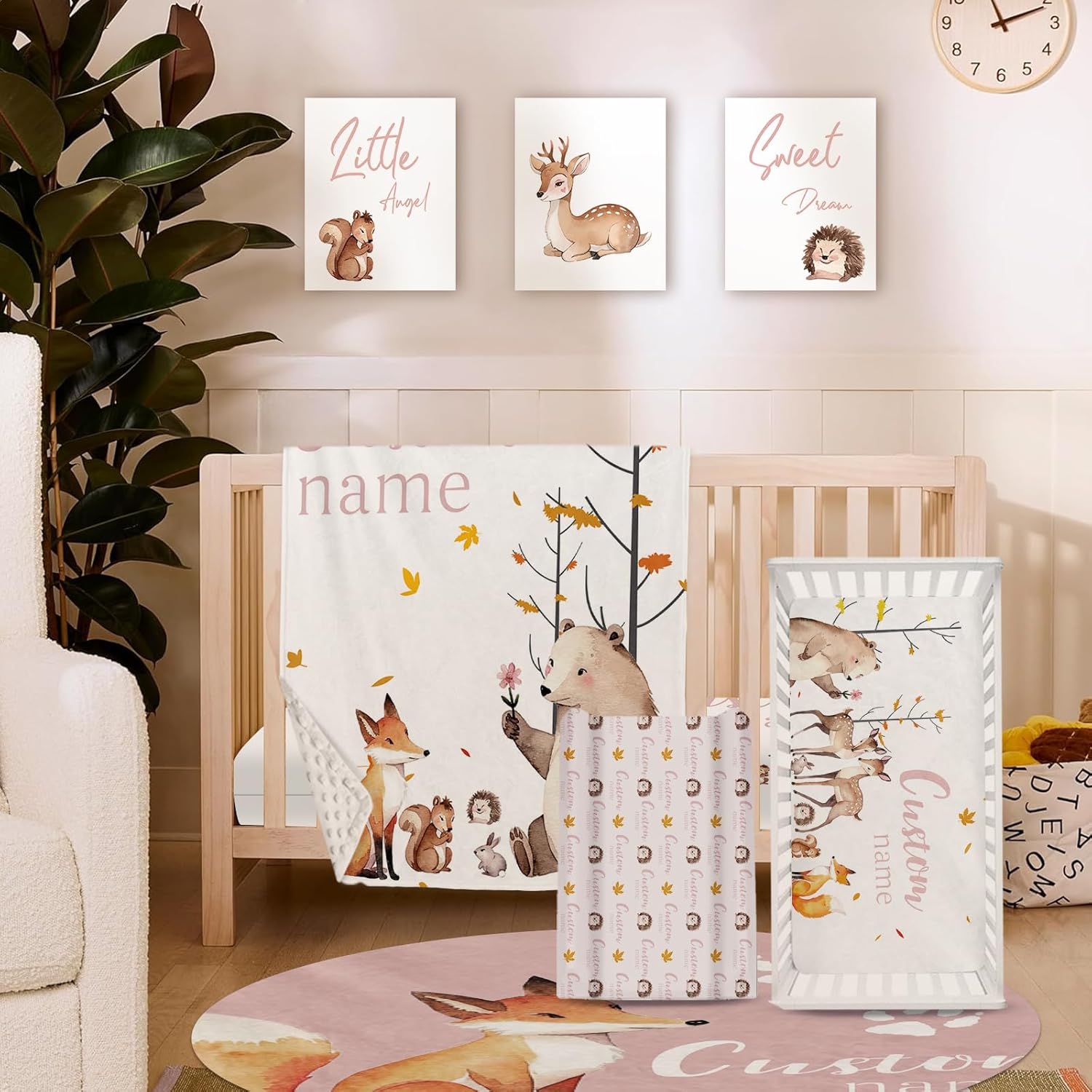 Personalized Baby Crib Bedding Set for Baby Girls, Fox Sika Deer Pattern Custom Name Baby Crib Sets 5-Pcs, Toddler Double Layer Blanket Fitted Sheets Changing Pad Cover Rug Wall Art Set