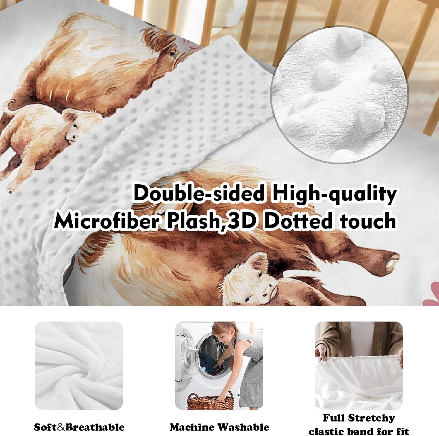 Personalized Baby Crib Bedding Set for Baby Girls, Pink Highland Cow Pattern Custom Name Baby Crib Sets 5-Pcs, Toddler Double Layer Blanket Fitted Sheets Changing Pad Cover Rug Wall Art Set