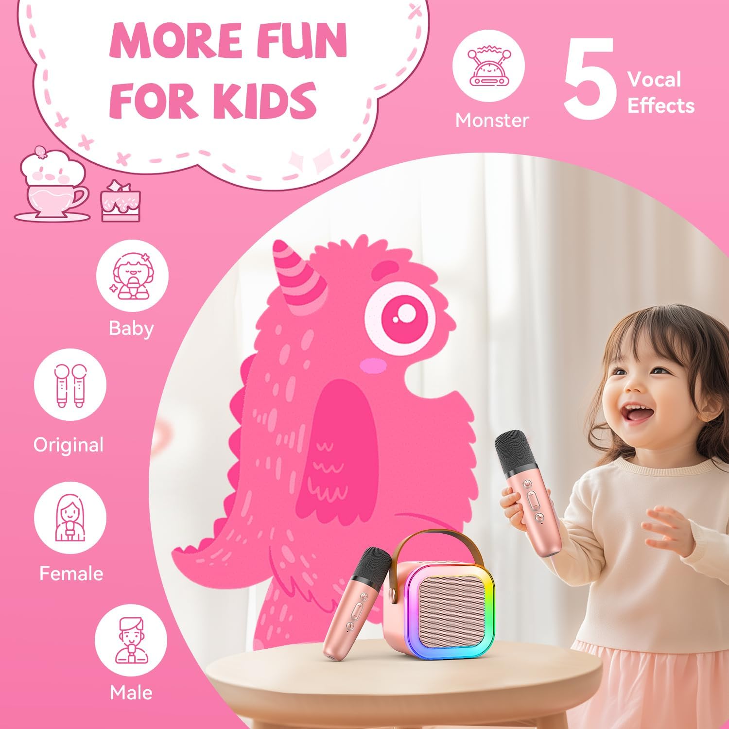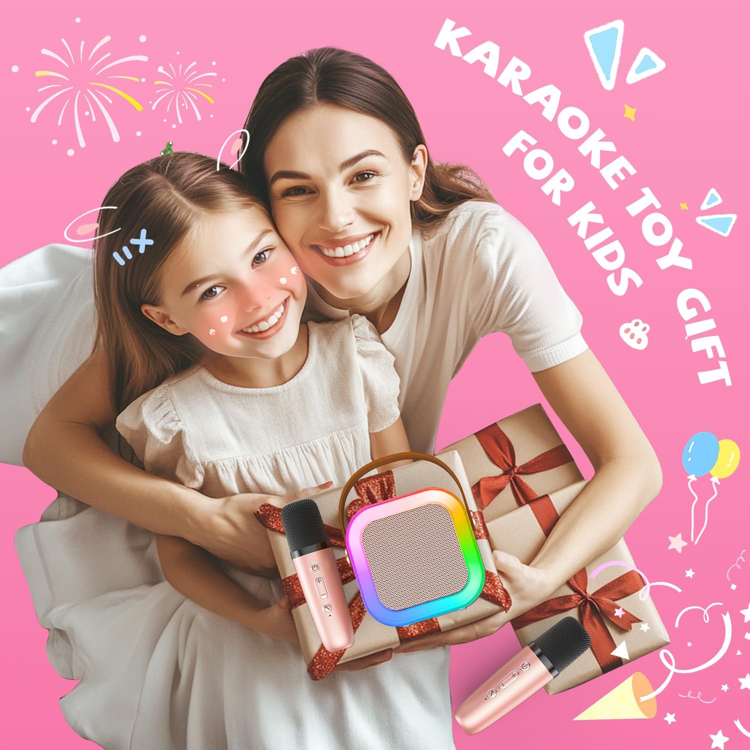 【2025 Newest】 Mini Karaoke Machine for Kids Girls & Boys - Portable Bluetooth Speaker with 2 Wireless Microphones - Kids Birthday Gifts for Ages 4-10 - Kids' Instrument Accessories - Rose Gold
