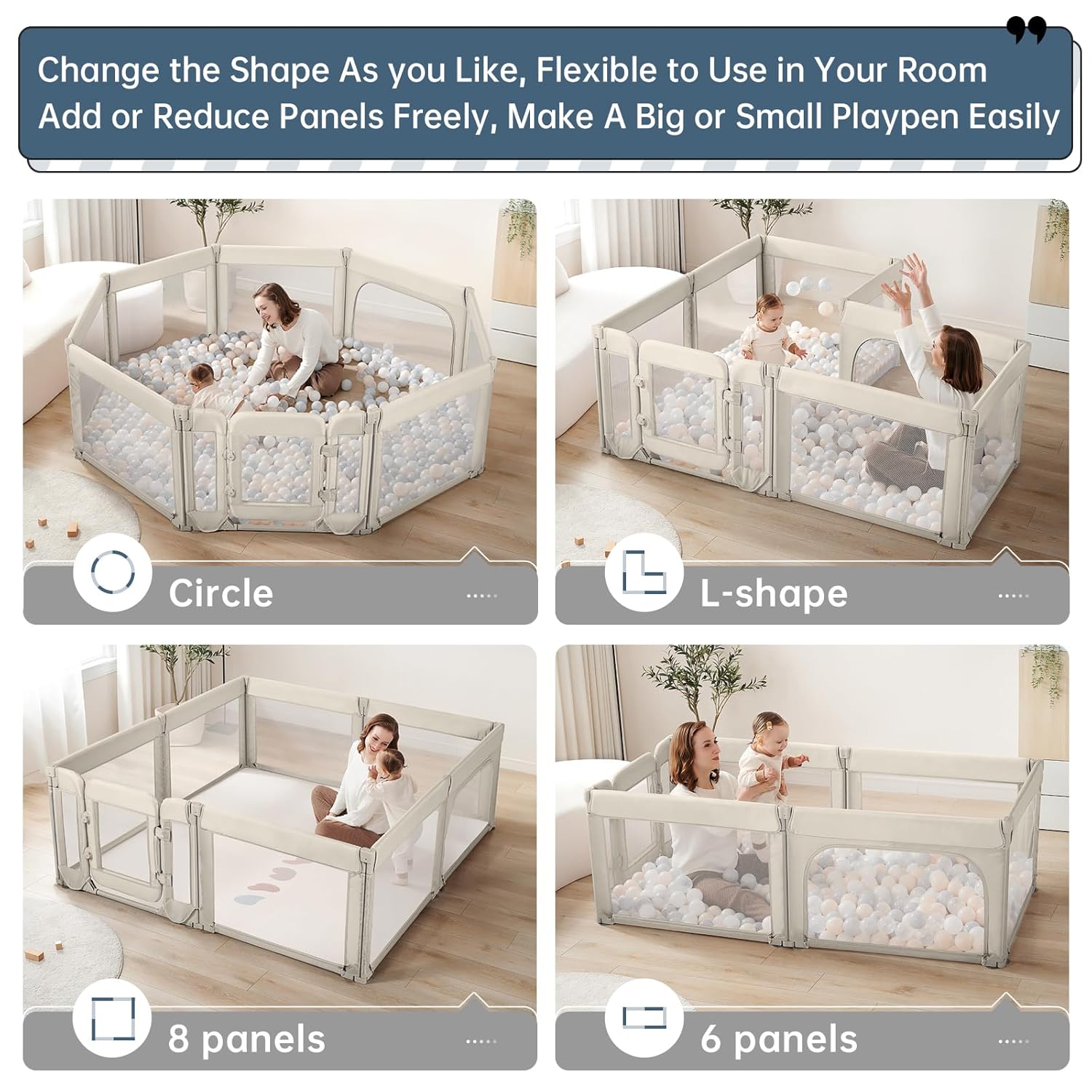 - [VERSATILE & AJUSTABLE]: This foldable baby playpen is made up of 8 panels that can be easily arranged into various shapes to suit your space at your will. Plus, with a baby door and two zipper doors, your child can easily enter and exit.It’s not just about keeping your child safe,it’s about giving them the freedom to explore while you relax!