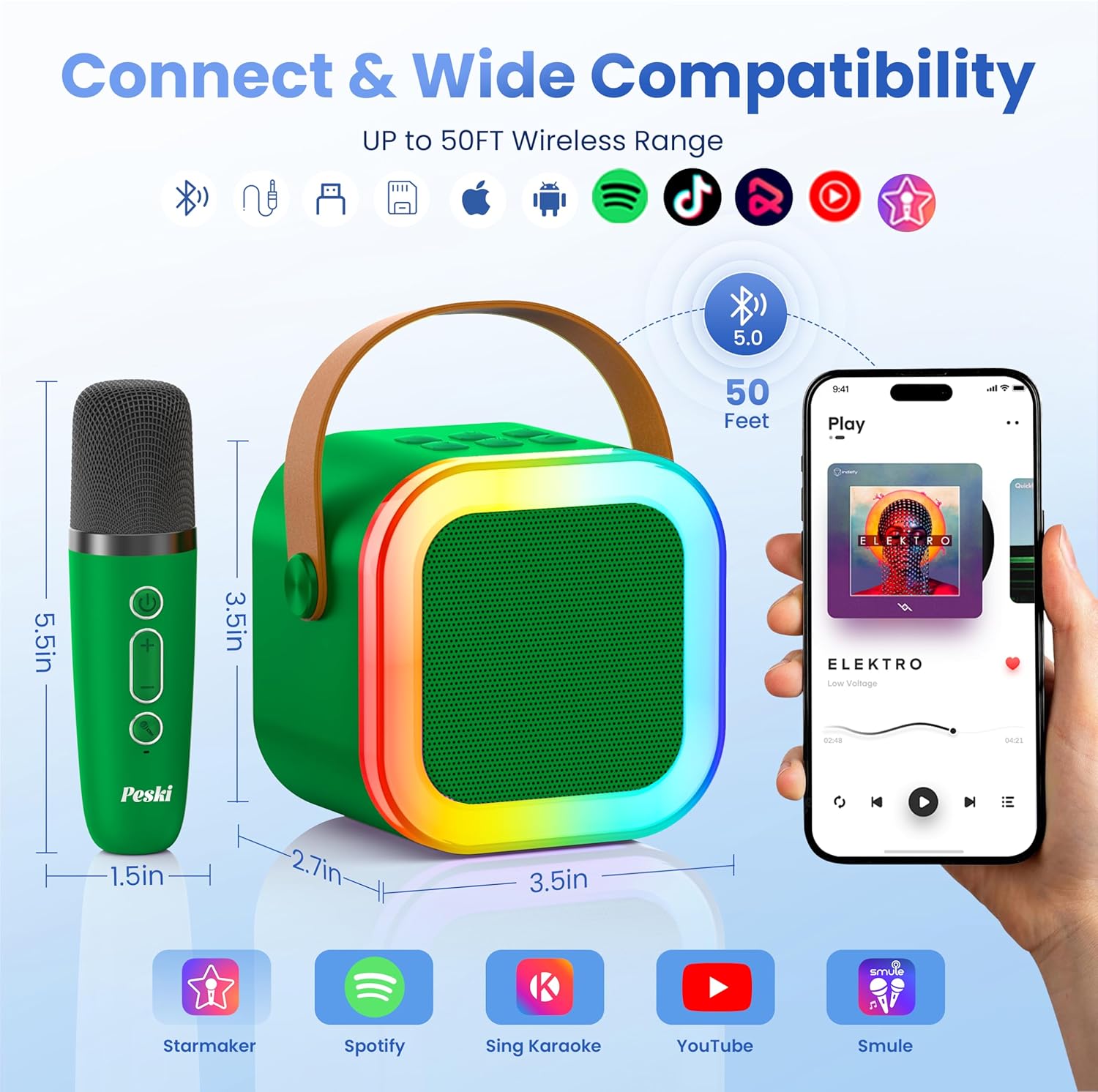 - 【BLUETOOTH 5.0 TWS TECHNOLOGY】: This bluetooth karaoke speaker for kids and adults with 2 microphones that automatically connect to each other, adopts new bluetooth 5.0 technology ensures instant pairing, providing stable transmission and 50ft long-distance without obstacles.this karaoke machine supports TF card, USB, and AUX input connections and is compatible with Android devices, TVs, iPads, tablets,car karaoke,and PCs.
