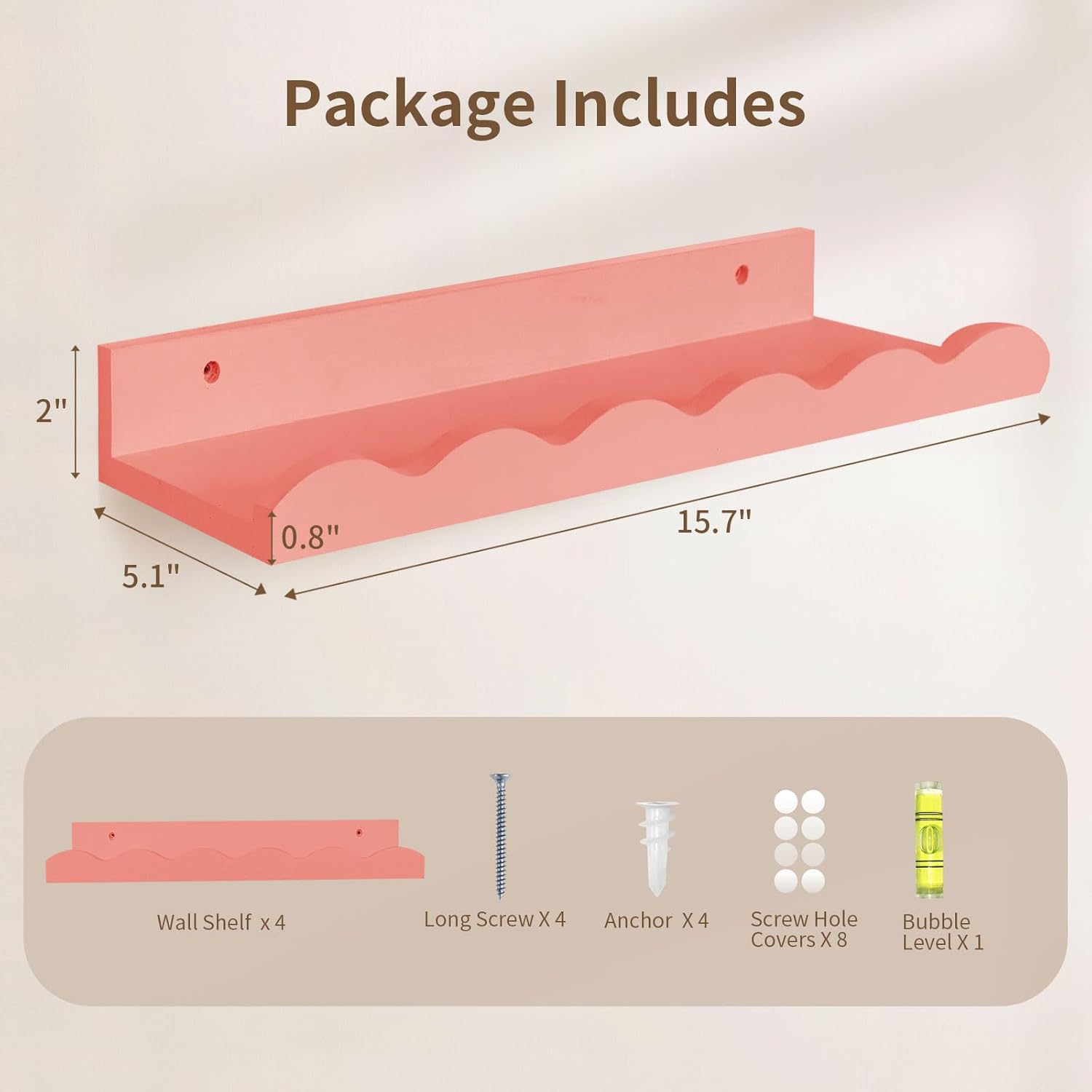 Nursery Book Shelves, 4 Pack Pink Floating Shelves for Wall, Wood Scalloped Shelves for Storage Books, Wall Book Shelf for Kids Rooms, Bedroom, Toddler Room, Baby Room, Nursery Decor