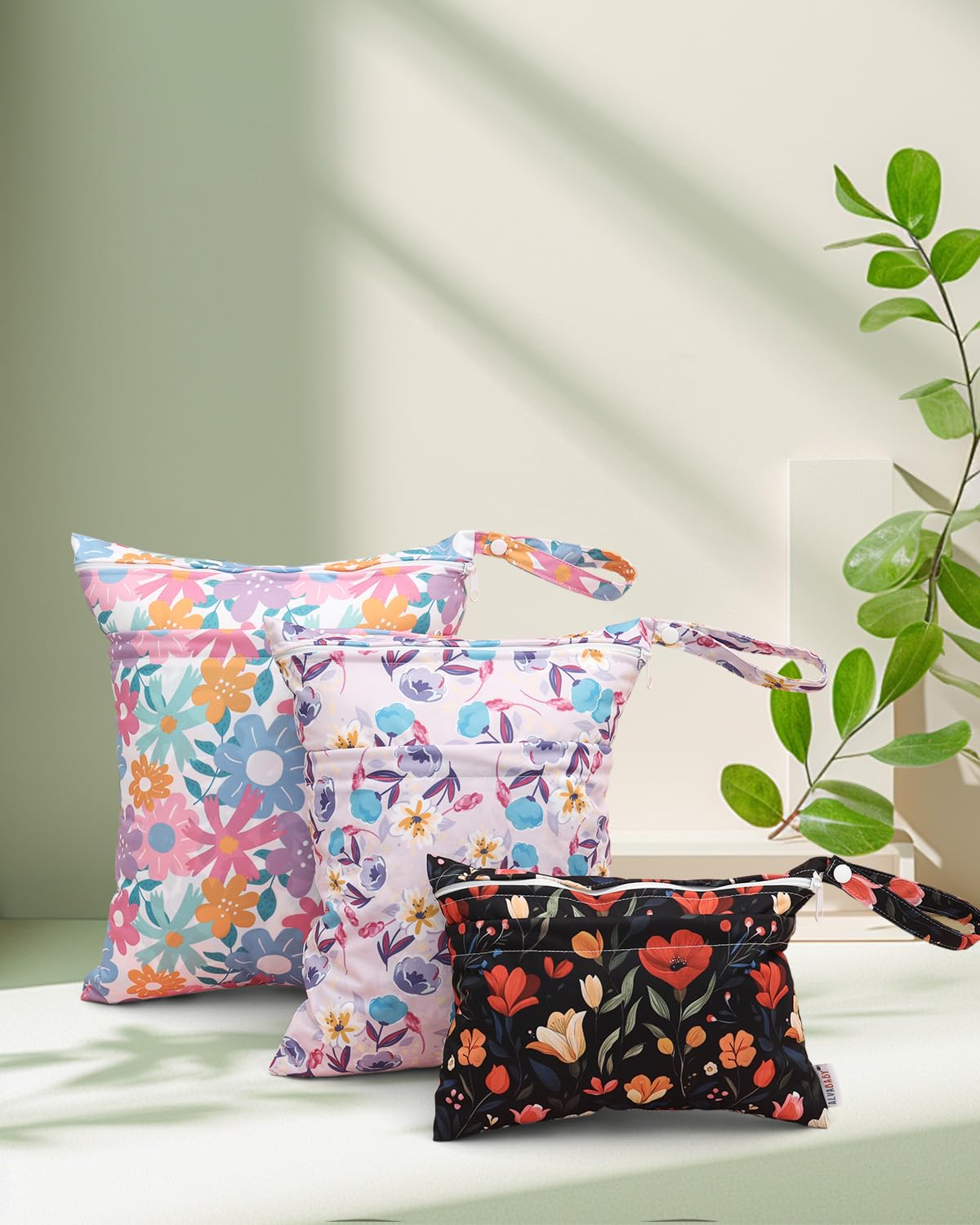 ALVABABY 3 Cloth Diaper Wet Dry Bags Waterproof Reusable with Two Zippered Pockets Travel Beach Pool Daycare Soiled Baby Items Yoga Gym Bag for Swimsuits or Wet Clothes Small medium Large 3L-SML07