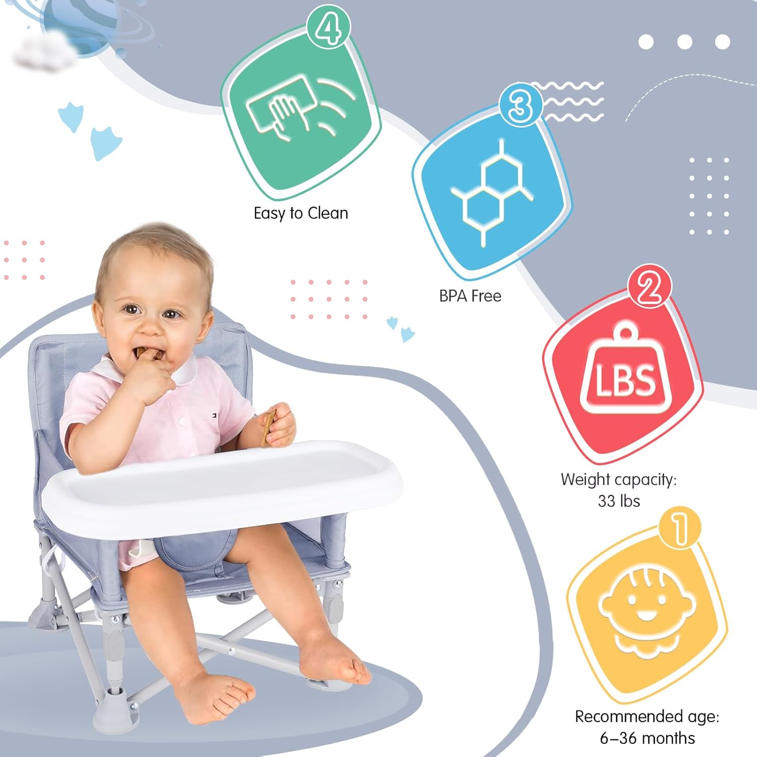 - Easy to Clean – This baby seat's removable tray is dishwasher safe, while the baby chair cover fabric is dense and smooth, allowing you to wipe off surface stains with a cloth easily.