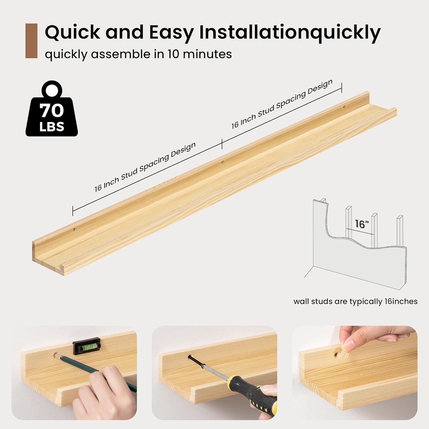 - Unique Solid Pine Wood Shelves: Each picture ledge is meticulously handcrafted from premium solid pine wood, showcasing one-of-a-kind grain patterns, organic color variations, and a hand-finished texture. No two shelves are identical—transform your space with a bespoke touch that reflects your individuality
