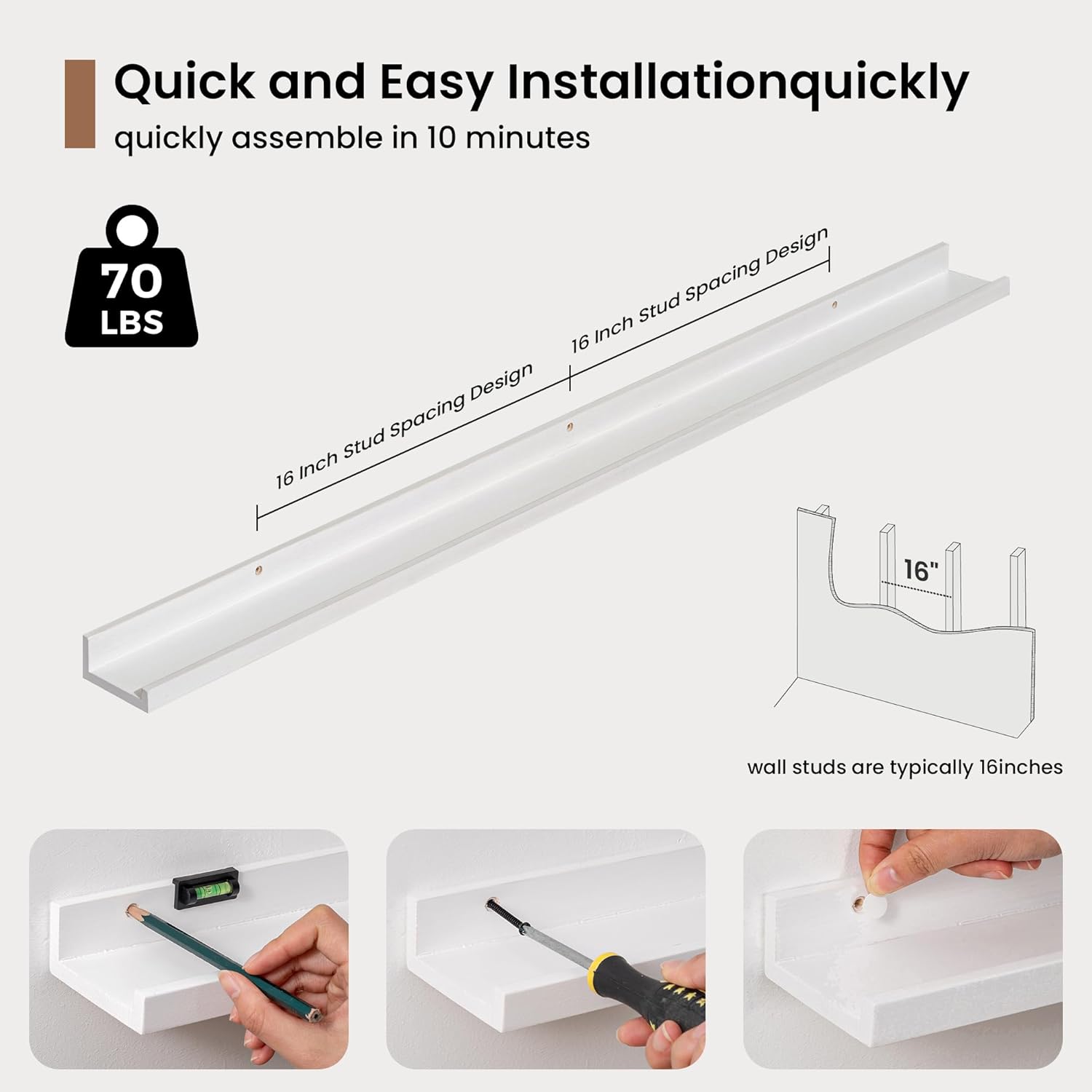 - Easy to Install: Fun Memories fully assembled solid pine wood picture ledge shelf set of 2 comes with the pre-drilled holes and necessary hardware including a mini level to make installation a breeze. The floating design creates a seamless, streamlined look, adding a touch of modern sophistication to your interior. If you have any questions about our products, please feel free to contact us