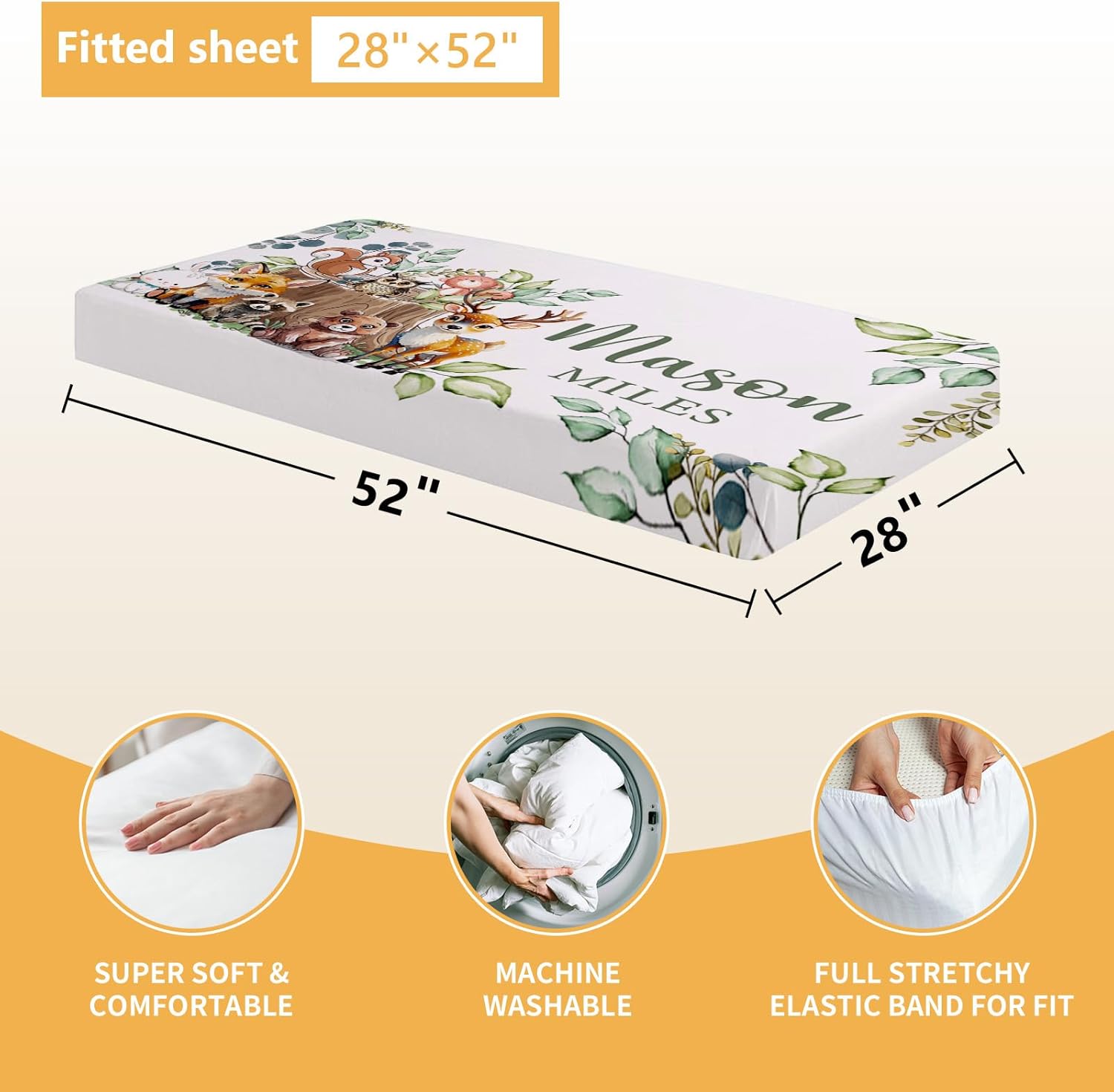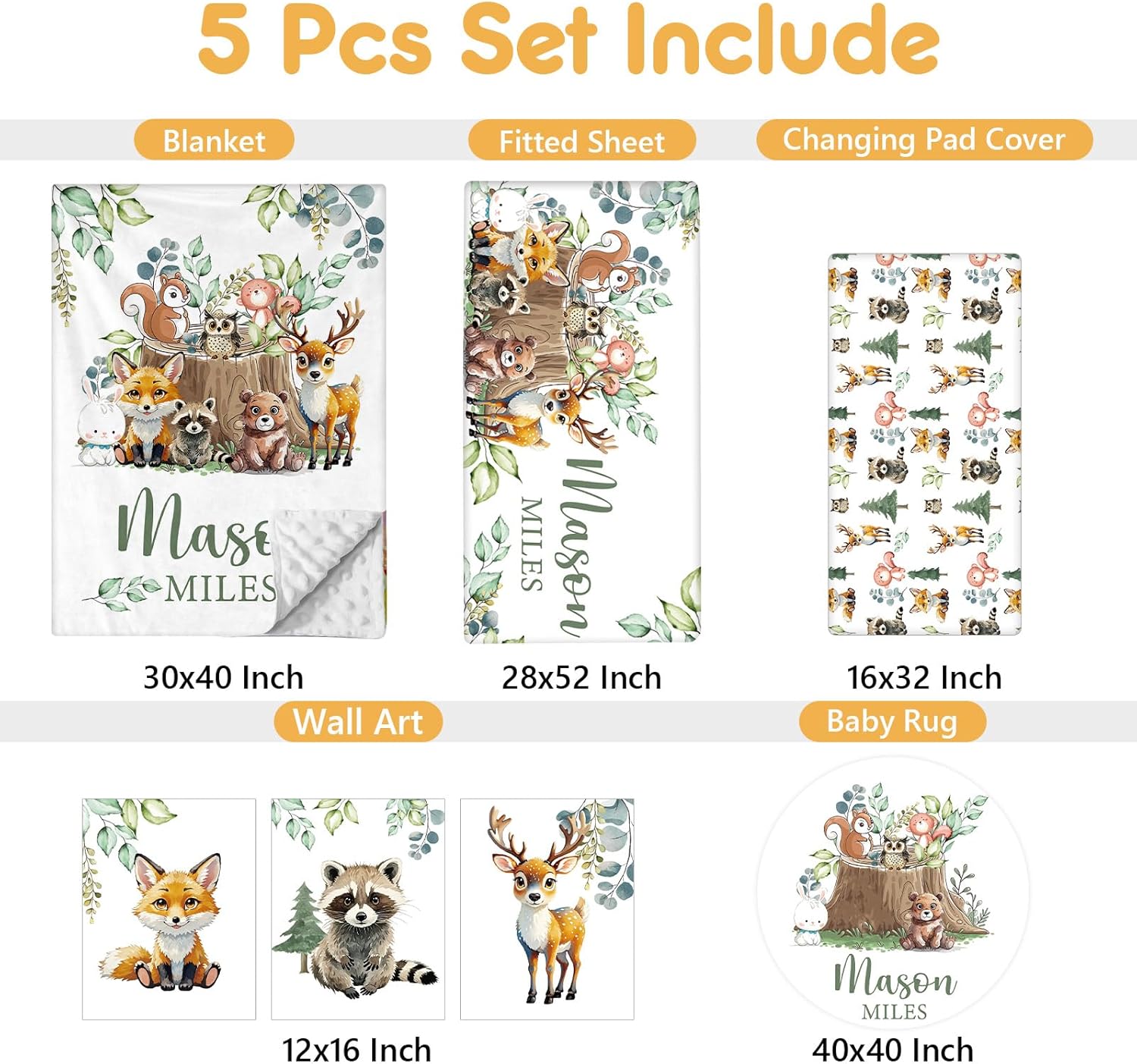 Personalized Baby Bedding Set, 5 Pcs Custom Baby Crib Sets with Name, Toddler Bedding Set for Baby Boys Girls, Forest Animal Double Layer Nursery Bedding Set, Customized Gifts for Infants Kids